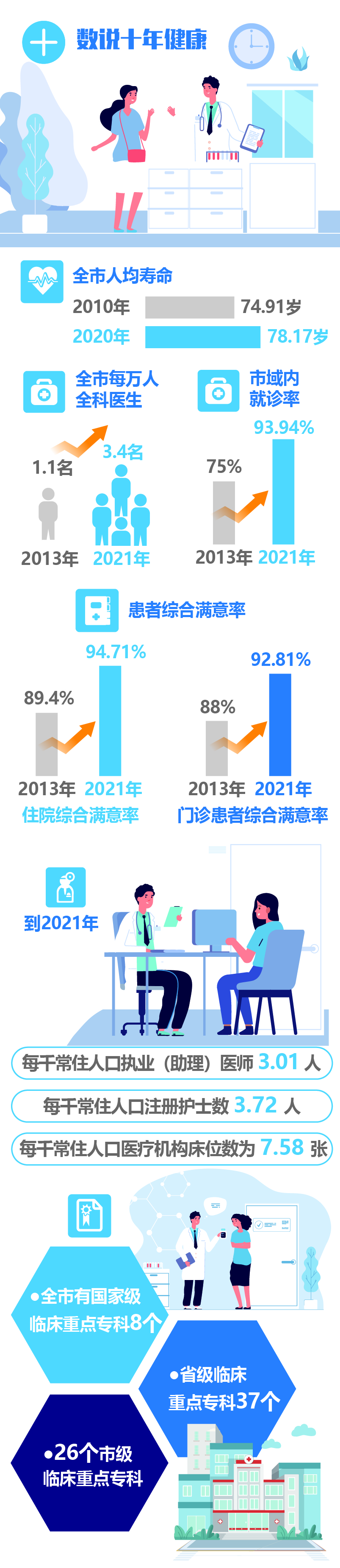 这十年,我市公立医院改革工作多次获国务院和省政府表彰,基层群众看病难、看病贵得到有效缓解,群众就医获得感、幸福感、安全感不断增强,住院、门诊患者综合满意率从2013年的89.4%、88.8%上升到2021年的94.71%、92.81%。