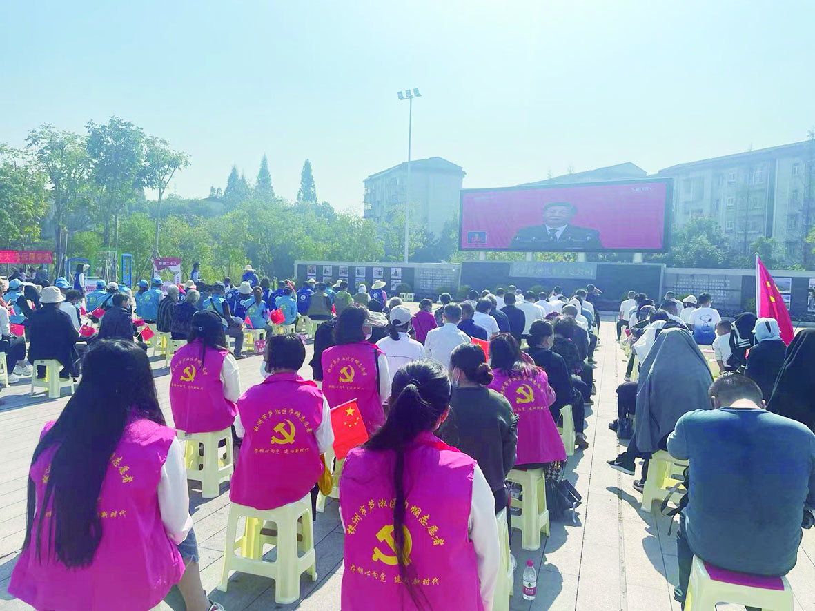 上百人在河长制主题公园观看党的二十大报告。 记者/俞强年 摄