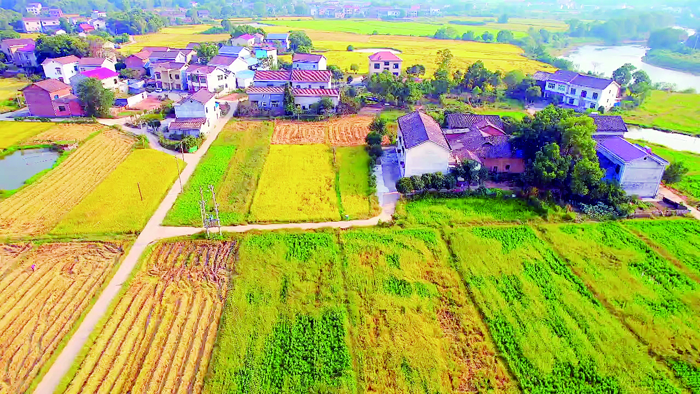 醴陵市茶山镇,金灿灿的稻田环绕村庄,美丽乡村宛如画卷。 通讯员/彭昕炜 摄