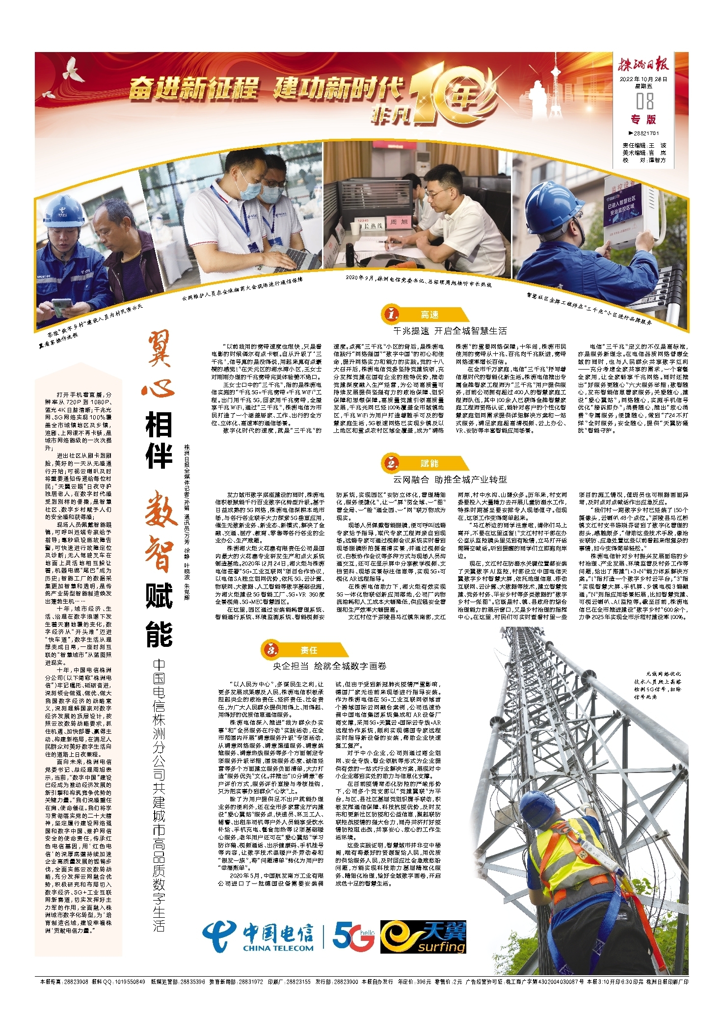 面向未来,株洲电信党委书记、总经理周旭表示,当前,“数字中国”建设已经成为推动经济发展的新引擎和构筑竞争优势的关键力量。“我们深感重任在肩、使命催征。我们将学习贯彻落实党的二十大精神,坚定履行建设网络强国和数字中国、维护网信安全的使命责任,传承红色电信基因,用‘红色电信’的深厚底蕴持续加速企业高质量发展的铿锵步伐,全面实施云改数转战略,充分发挥云网融合优势,积极研究和布局切入数字经济、5G+工业互联网新赛道,切实发挥好主力军的作用,全面融入株洲城市数字化转型,为‘培育制造名城,建设幸福株洲’贡献电信力量。”