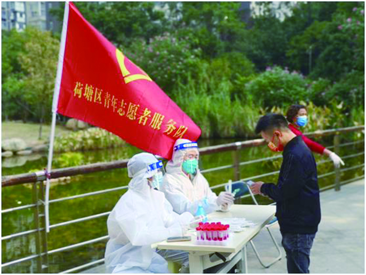 11月2日,共青团荷塘区委迅速行动,发布招募令,第一时间召集了200余名青年志愿者。他们按照就近服务原则,协助各社区及核酸检测点开展秩序维护、信息登记、两码查验、重点人员管控等工作。截至目前,全区已有400余名青年志愿者活跃在疫情防控一线。