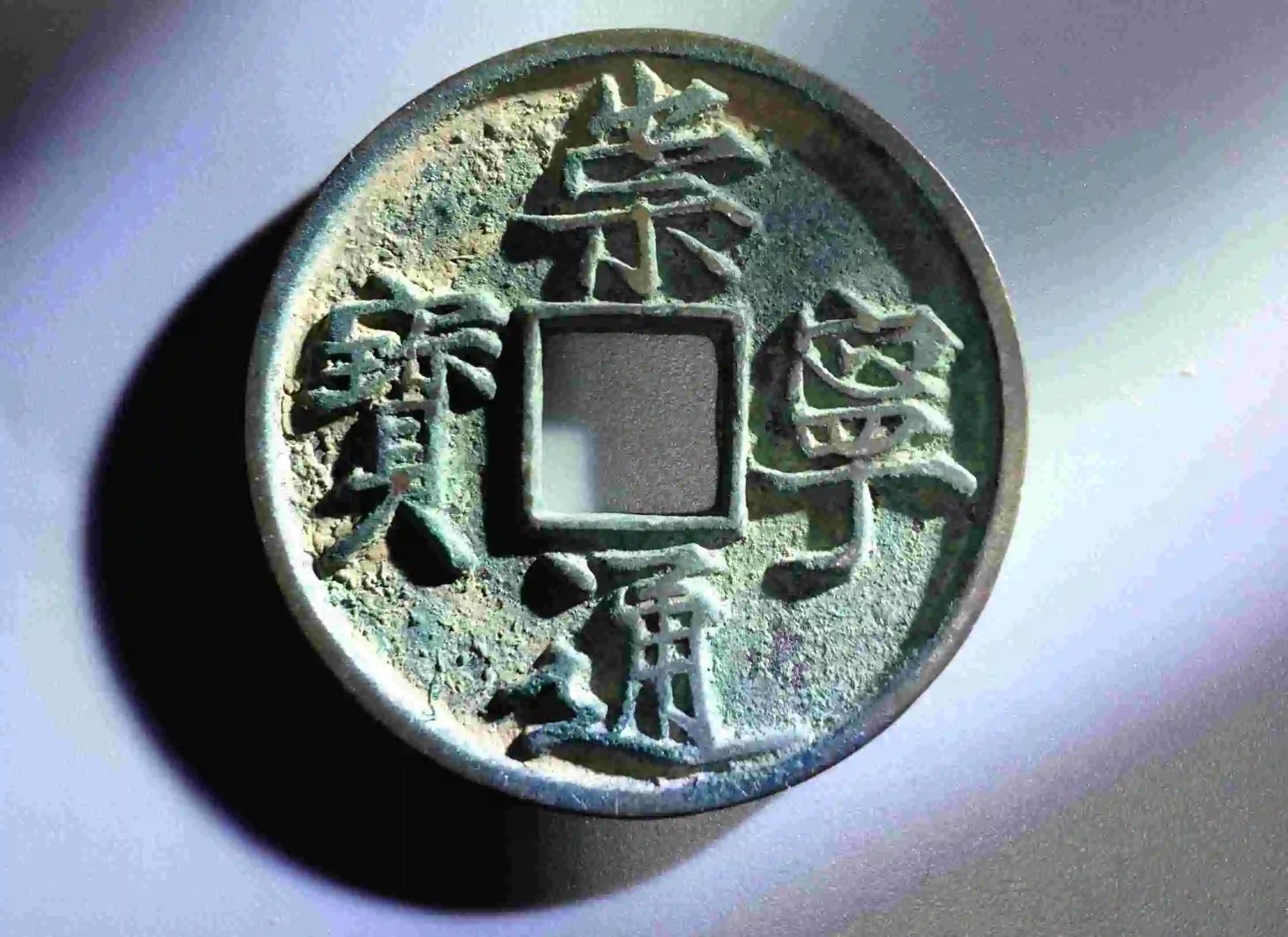 崇宁为北宋徽宗年号,崇宁通宝之钱文为徽宗亲书,所以又被称为御书钱。该钱文书法清秀骨瘦,铁划银钩,是徽宗赵佶瘦金书体存留世间的真实显现。关于此钱,还有一个传说,谓其面文为蔡京所书,而蔡京书写时别有用心将“崇”字的山和宗的竖笔上下贯通,连成一线;将“宁”字繁体之中的“心”省略,被人指责为“有意破宋,无心宁国”……也正因了精美的书法艺术和似是而非的传说故事,崇宁通宝向来被视为中国古代铸币中的艺术精品,在古玩圈中也一直以价值不菲而著称。