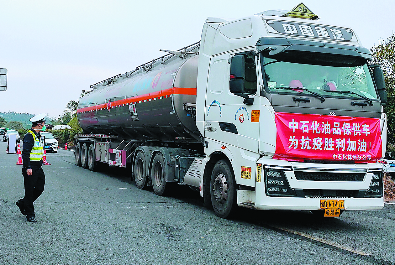 交警指挥保障生产生活资料供应的车辆顺利通行。 通讯员 供图