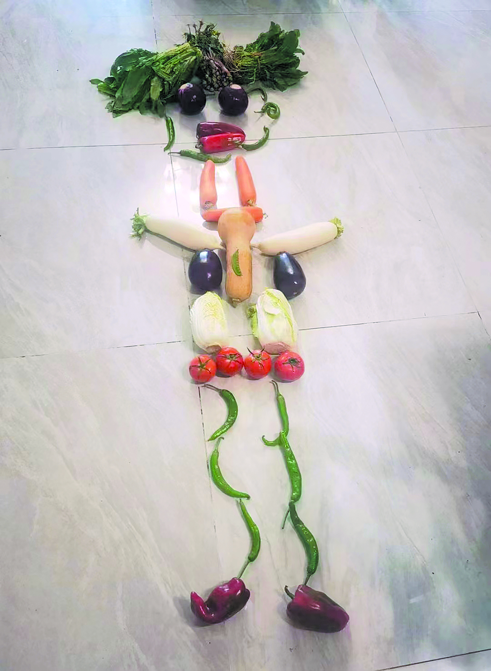 ◀居民用收到的蔬菜包“作画”。 通讯员/周慧供图