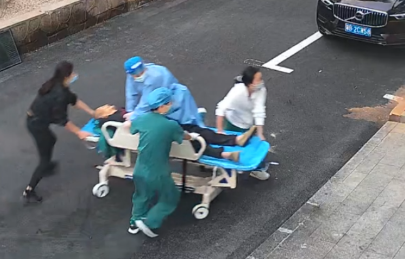 市三三一医院的护士跪在转运平车上为患者做心肺复苏。(视频截图)