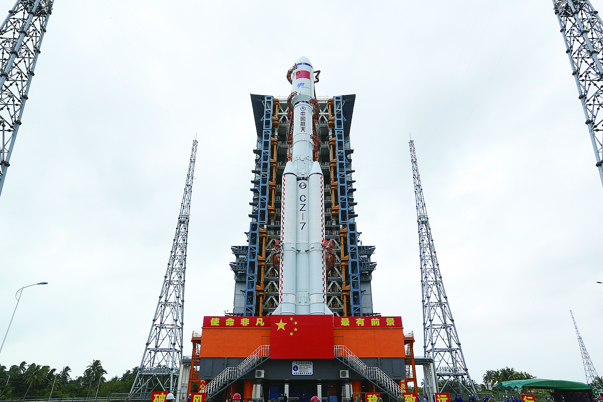 11月9日,天舟五号货运飞船与长征七号遥六运载火箭组合体转运至发射塔架。新华社发