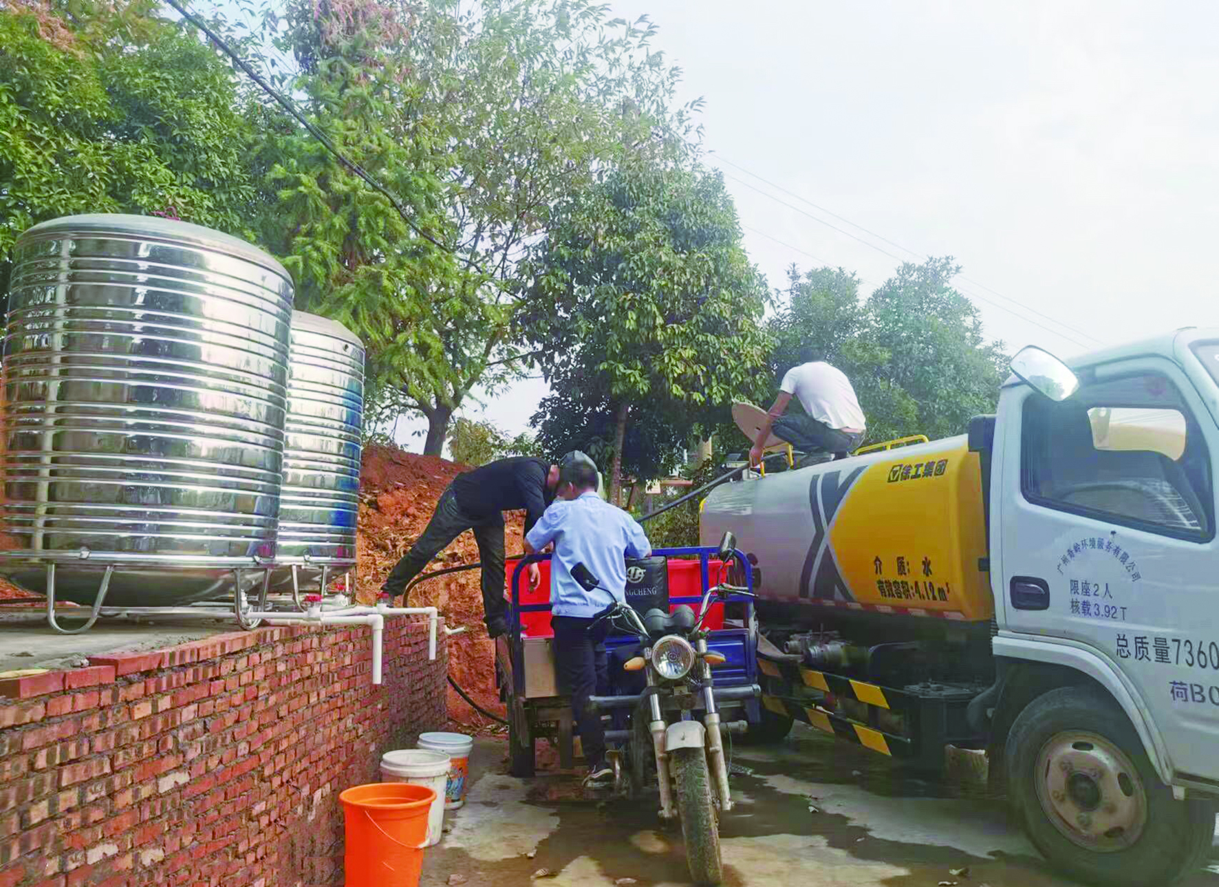 受持续干旱天气影响,古岳峰镇11个村(居)均出现了不同程度的旱情,不少村民家中水井干涸见底。为解决群众用水困难,该镇党委政府统筹安排,协调7台送水车供各村轮流使用,从8月17日起,每天早7时至晚上12时,持续上门送水。疫情期间,镇村一边严格按照疫情防控要求,落实各项防疫措施,一边想方设法找水解决饮水难。受交通管制影响,该镇无法去原定的取水点之一——三门水厂取水,于是镇村与村民协商沟通,选取了几处居民家的深井作为临时取水点,镇干部全员在岗包村联点,组织村干部、志愿者送水,或引导村民在规定地点有序排队取水。