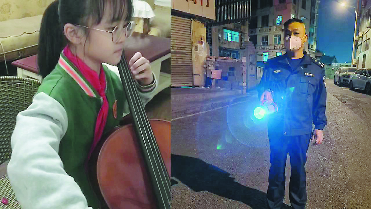 ◀左图为静静通过视频,为爸爸演奏《我的祖国》,右图为曹东正在执勤。