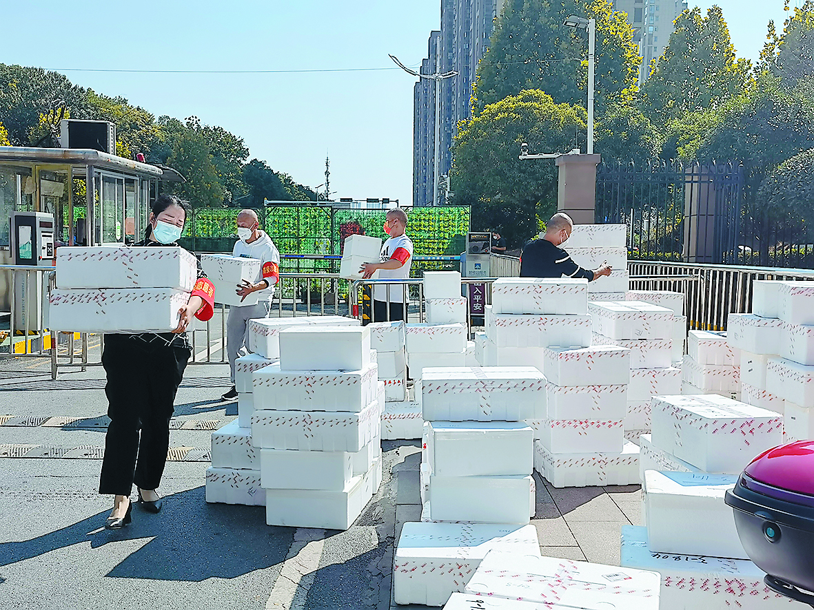 志愿者协助社区干部为小区居民搬运生活物资。