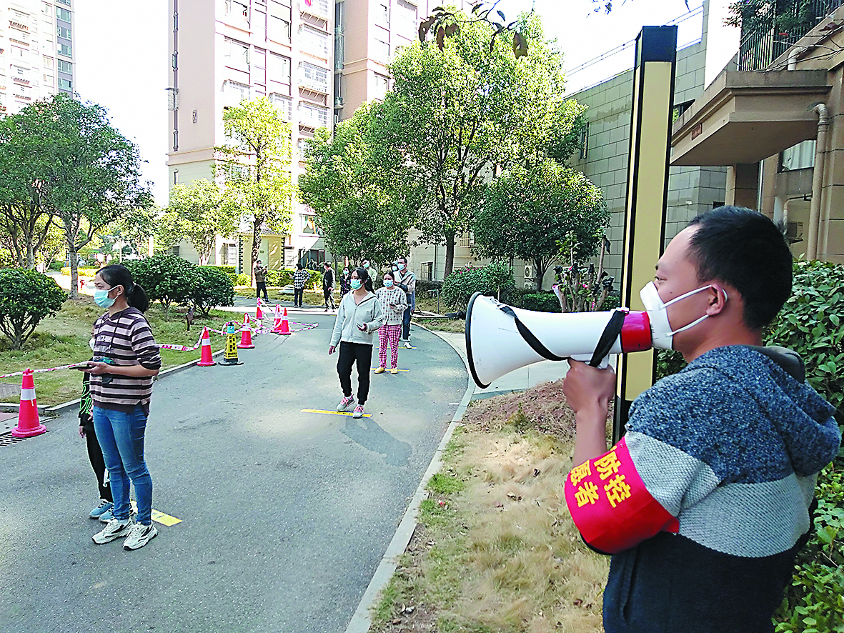 志愿者在封控小区值守。