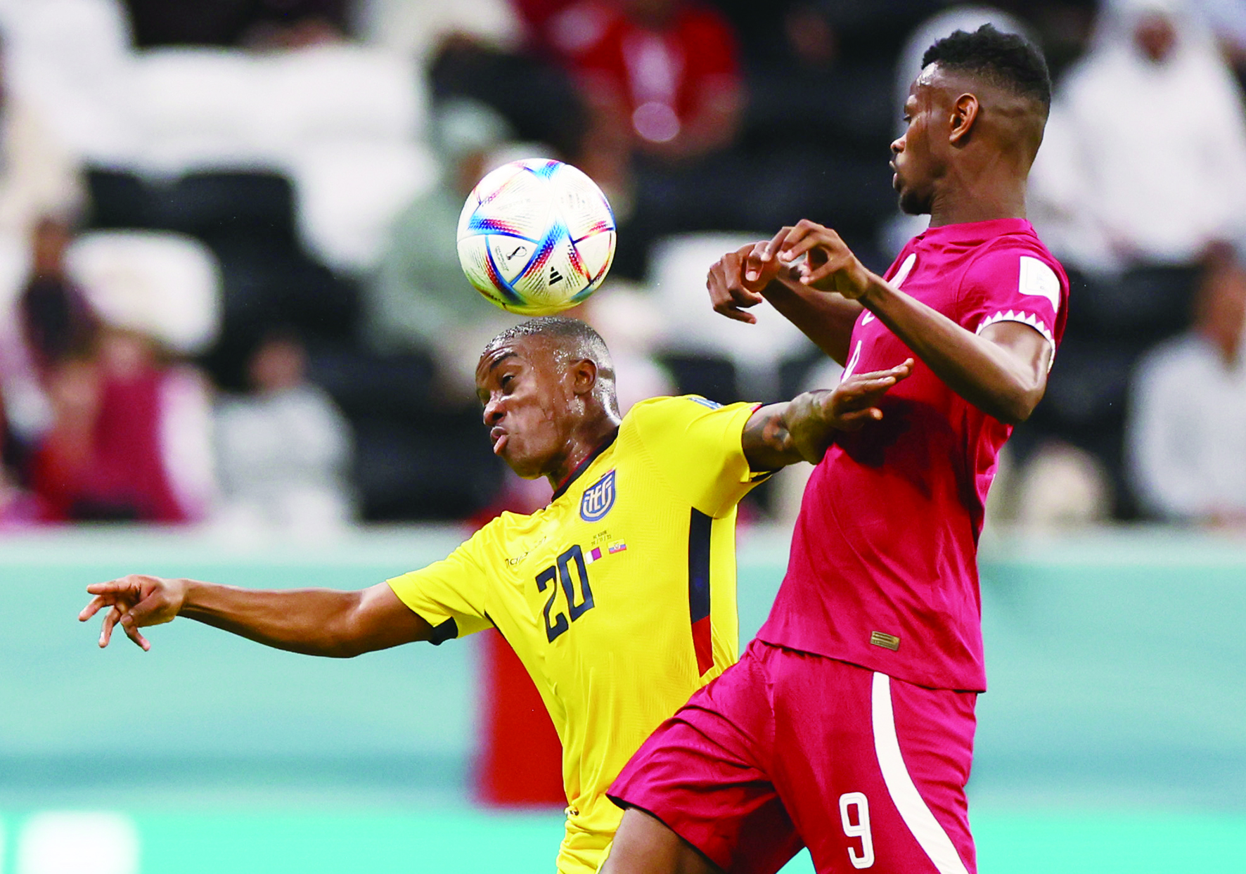 11月20日,厄瓜多尔队球员赫格森·门德斯(左)与卡塔尔队球员穆罕默德·蒙塔里在比赛中拼抢。