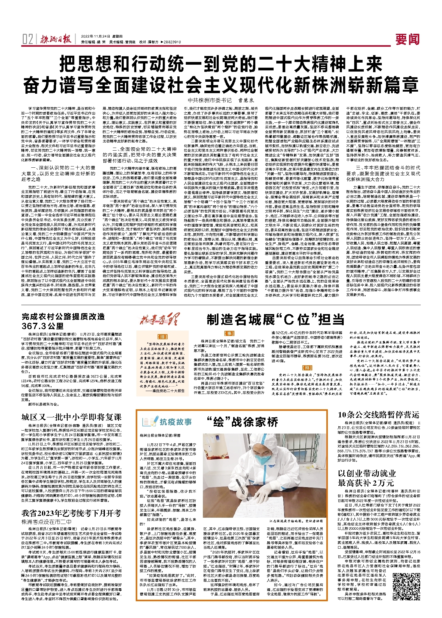 学习宣传贯彻党的二十大精神,是当前和今后一个时期的首要政治任务。习近平总书记作出了“五个牢牢把握”“三个全面”等重要指示;中央印发的《关于认真学习宣传贯彻党的二十大精神的决定》和省委《关于认真学习宣传贯彻党的二十大精神的通知》等系列文件,作了非常全面的部署。我们要按照习近平总书记重要指示和党中央、省委部署要求,一体学习领会和贯彻落实大会报告、相关文件和习近平总书记重要指示精神,切实用党的二十大精神统一思想、统一意志、统一行动,奋力谱写全面建设社会主义现代化新株洲崭新篇章。