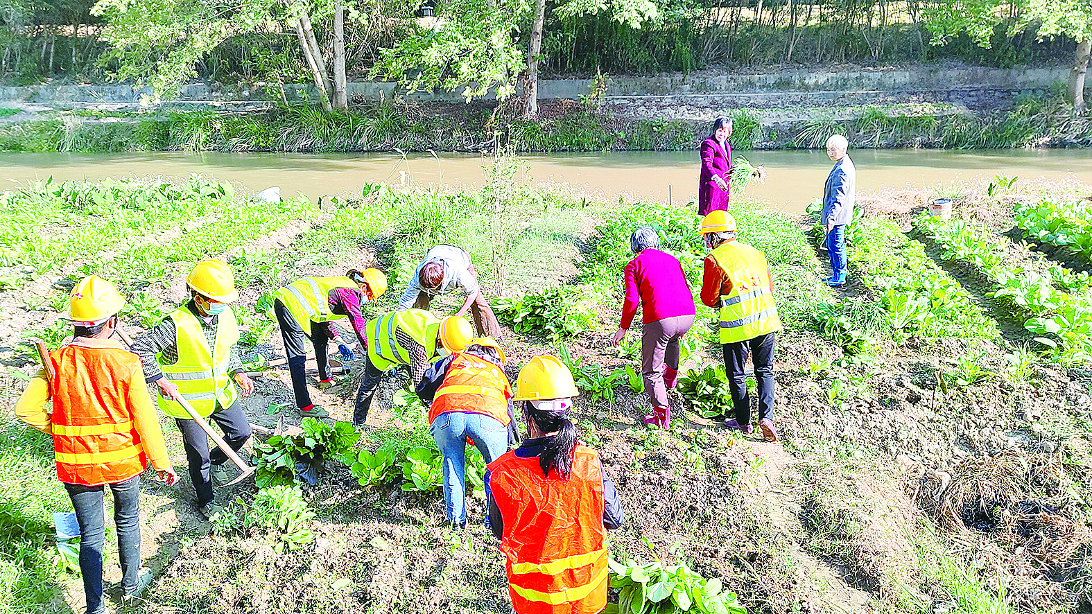 志愿者与居民一起清理河岸上的违规菜地。通讯员供图