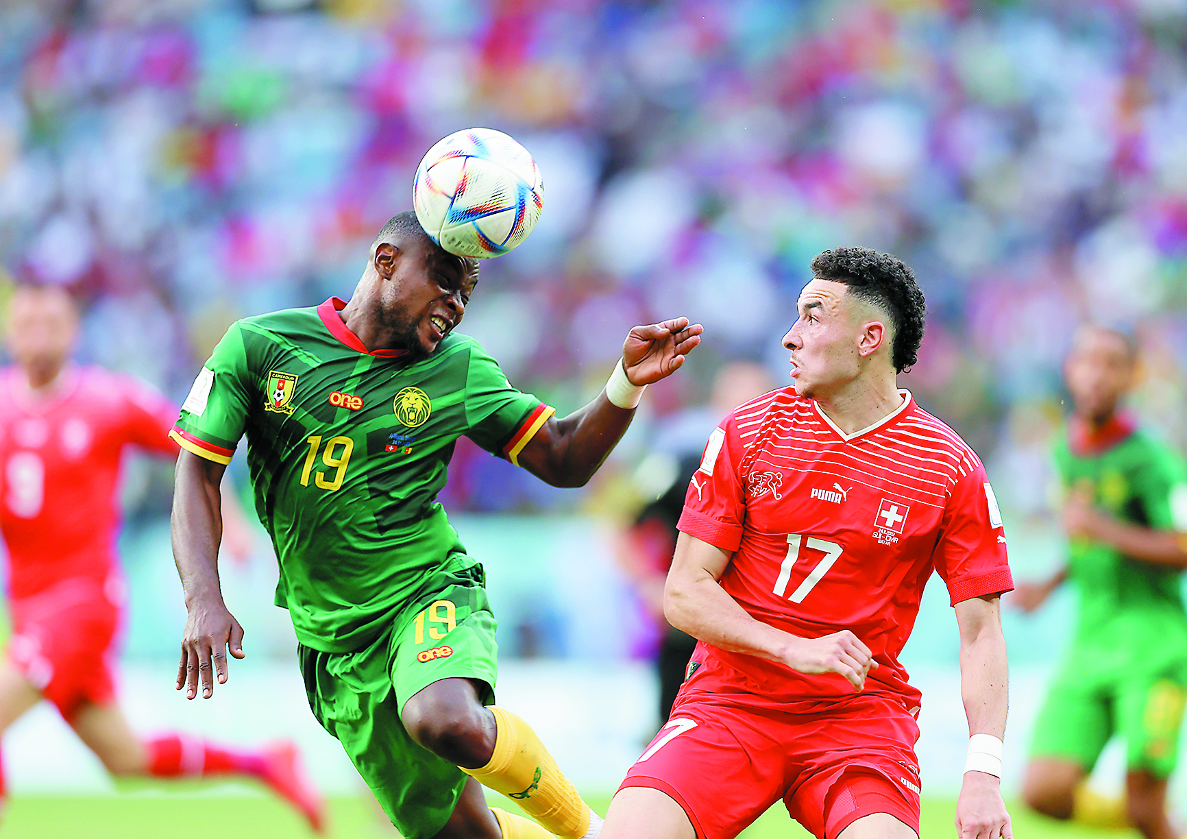 11月24日,喀麦隆队球员法伊(左)与瑞士队球员鲁文·巴尔加斯拼抢。新华社