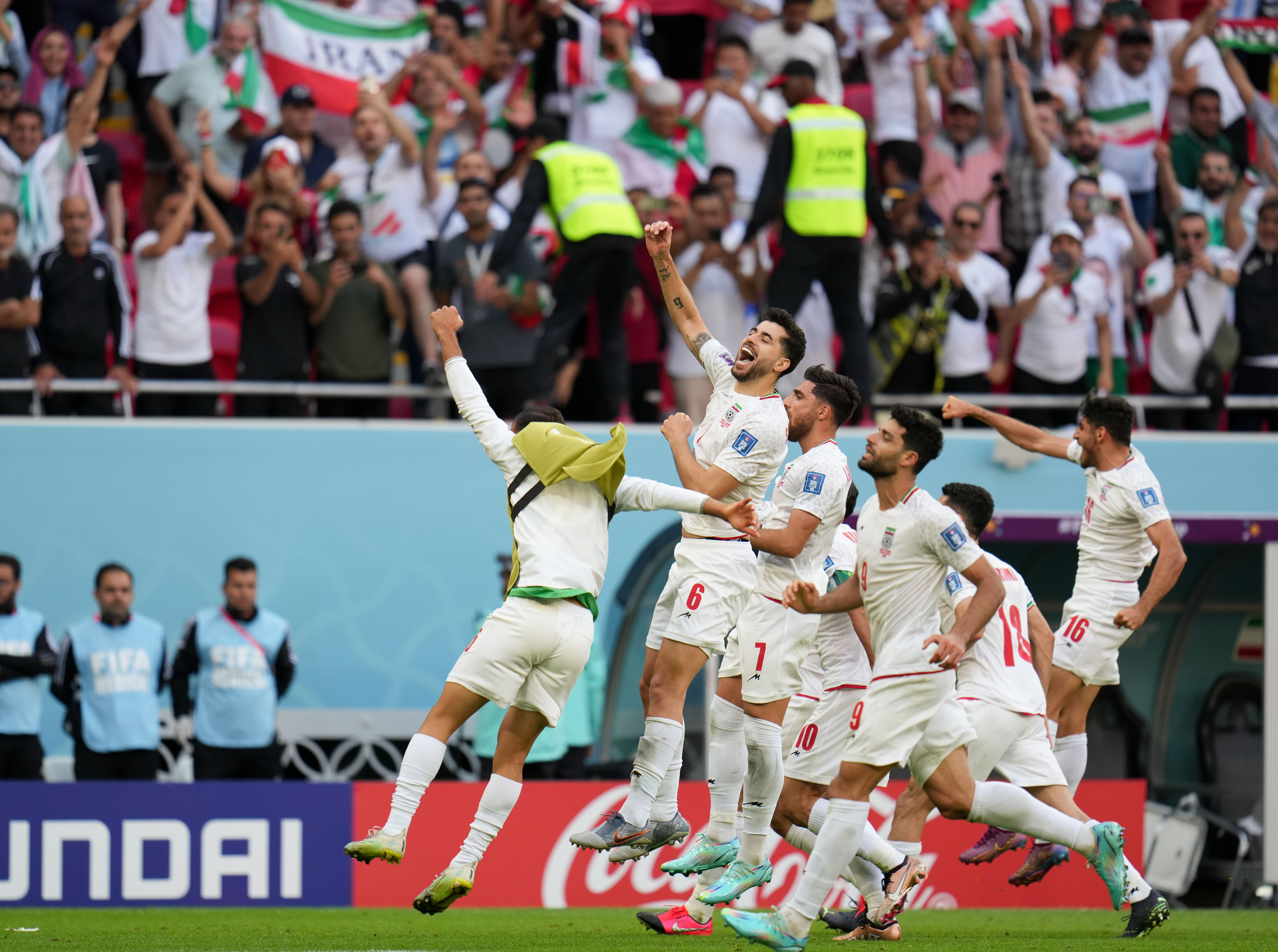 凭借在伤停补时阶段的两粒进球,伊朗队在11月25日的卡塔尔世界杯B组比赛中2:0战胜威尔士队,球队主教练奎罗斯认为,这场荡气回肠的胜利,使得球队走出了首场惨败的阴影。图为当日的伊朗队球员庆祝比赛胜利。 据新华社