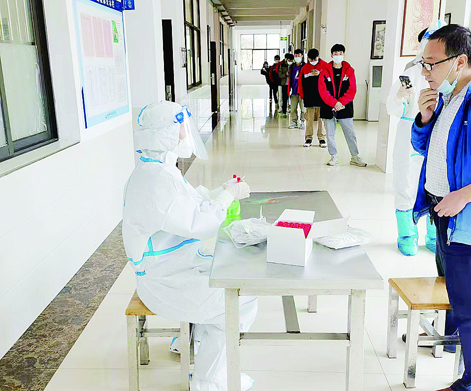 经专门培训,市特教学校校医变身“大白”为师生做核酸检测采样。 记者/戴凛 摄