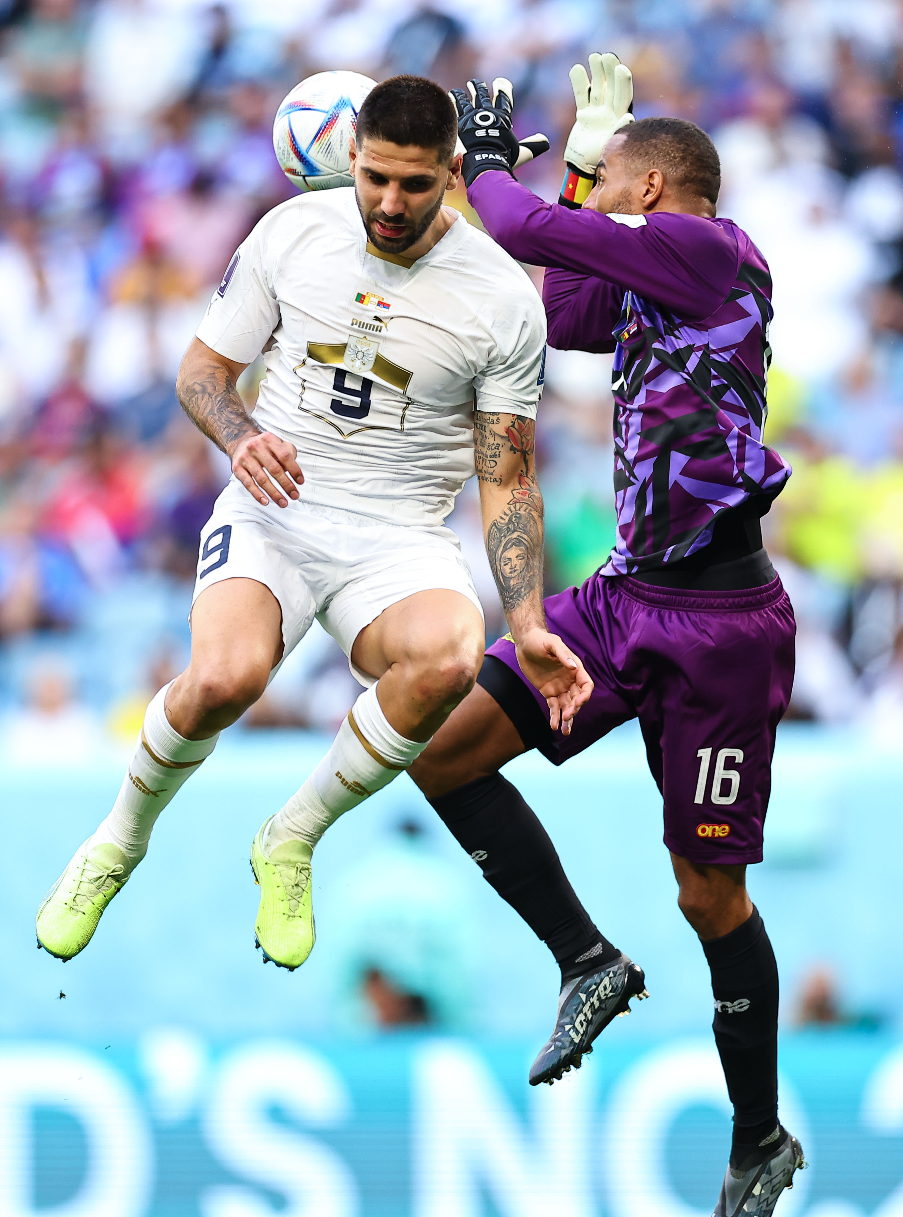 11月28日,喀麦隆队守门员埃帕西-姆博卡(右)扑救塞尔维亚队球员亚历山大·米特罗维奇的射门。 新华社记者 丁旭 摄