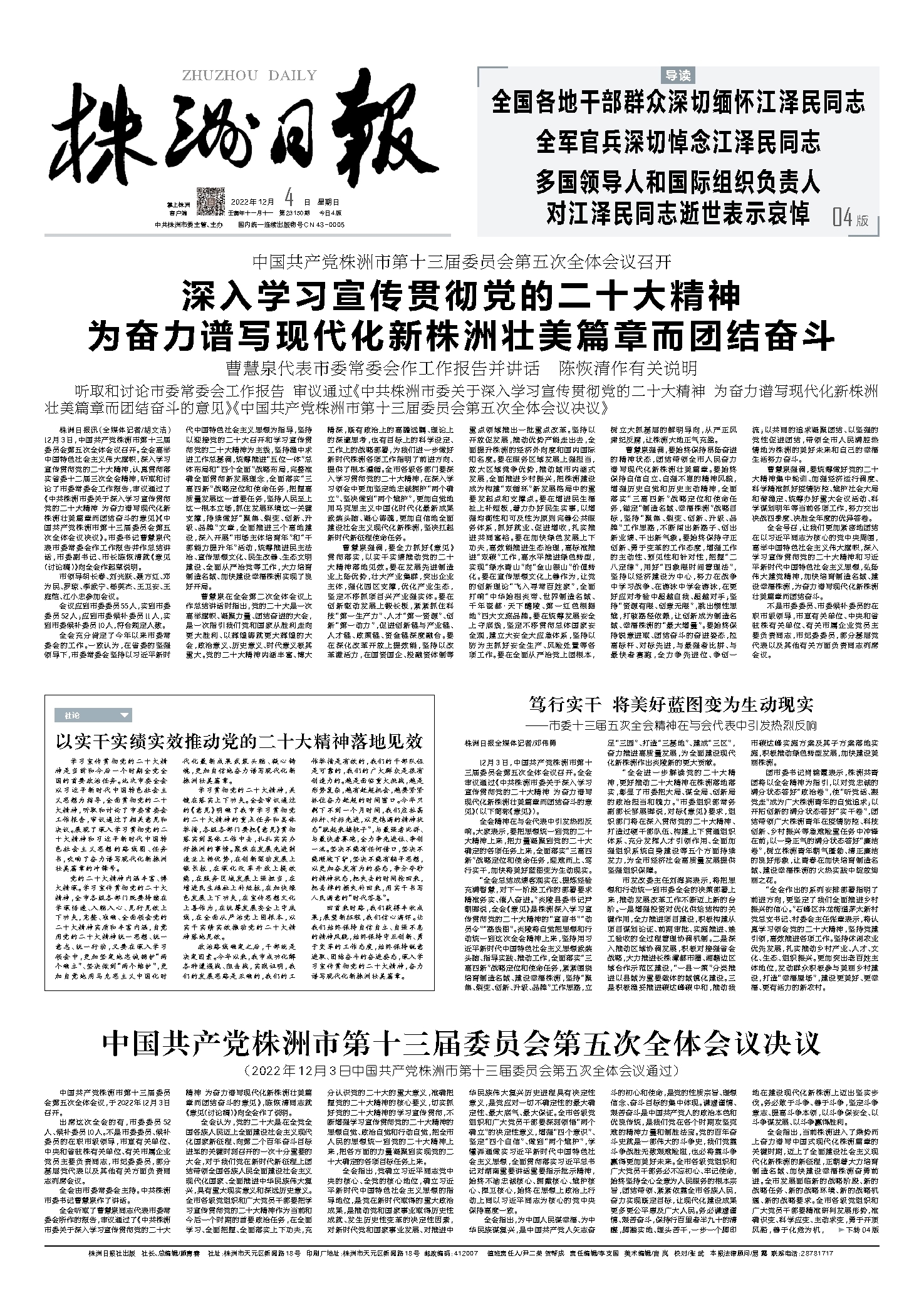 中国共产党株洲市第十三届委员会第五次全体会议,于2022年12月3日召开。