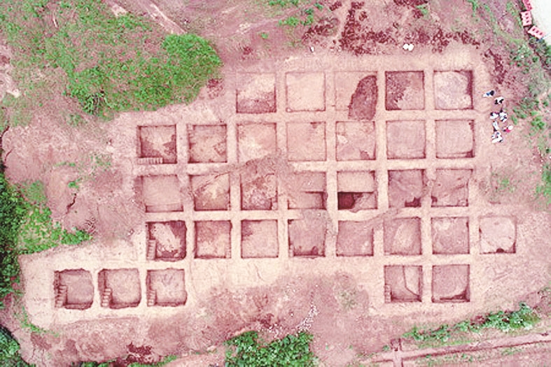猪垅背墓群探方发掘航拍照。