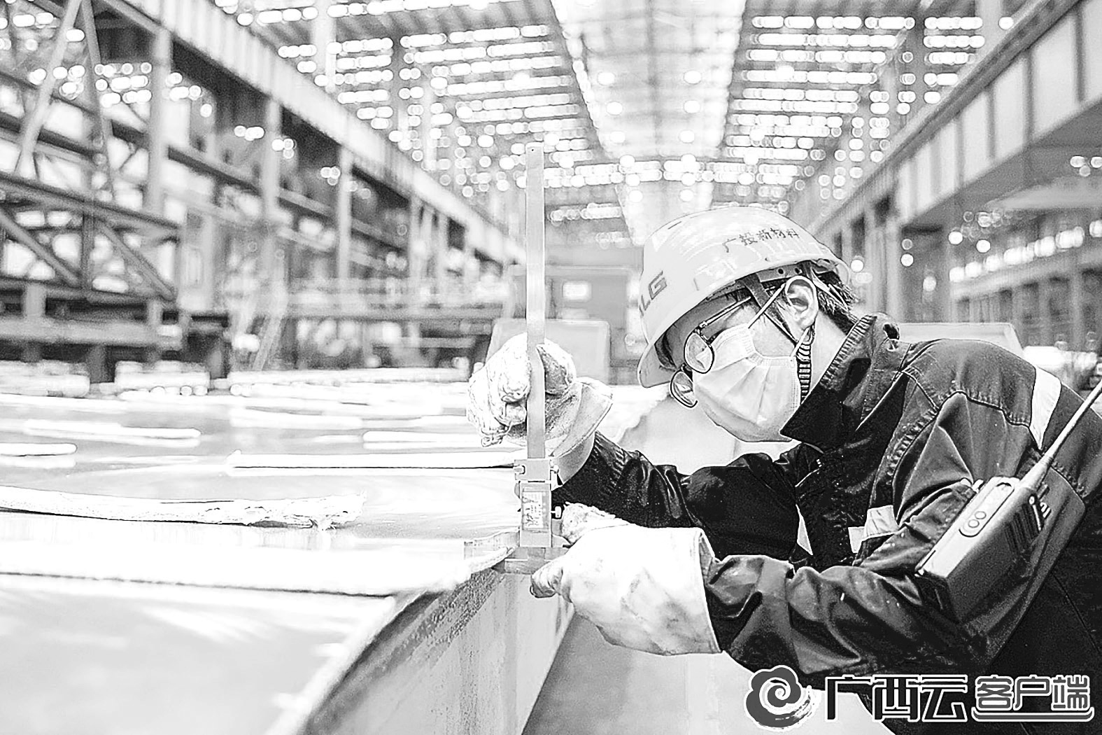 南南铝加工有限公司技术工人正在检测产品质量。 范先芳 摄