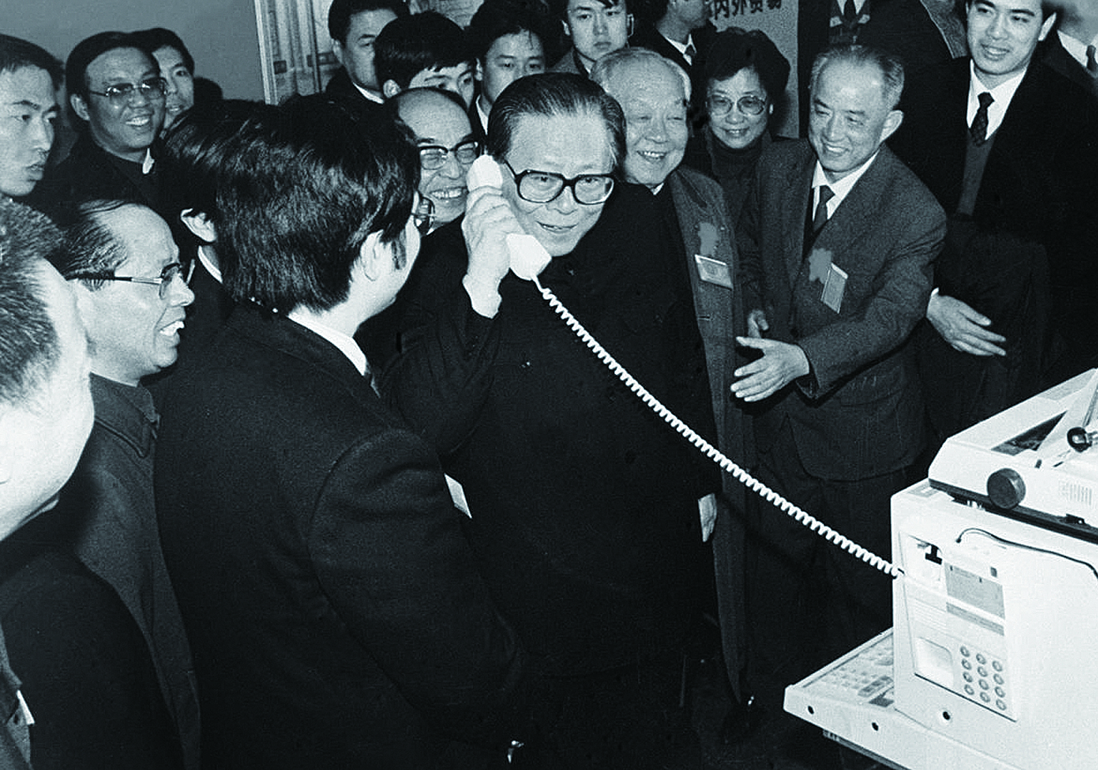 ▲1984年5月,江泽民同志在北京展览馆举行的全国电子新产品展览会上,试用国际长途电话向远方的工作人员问候。
