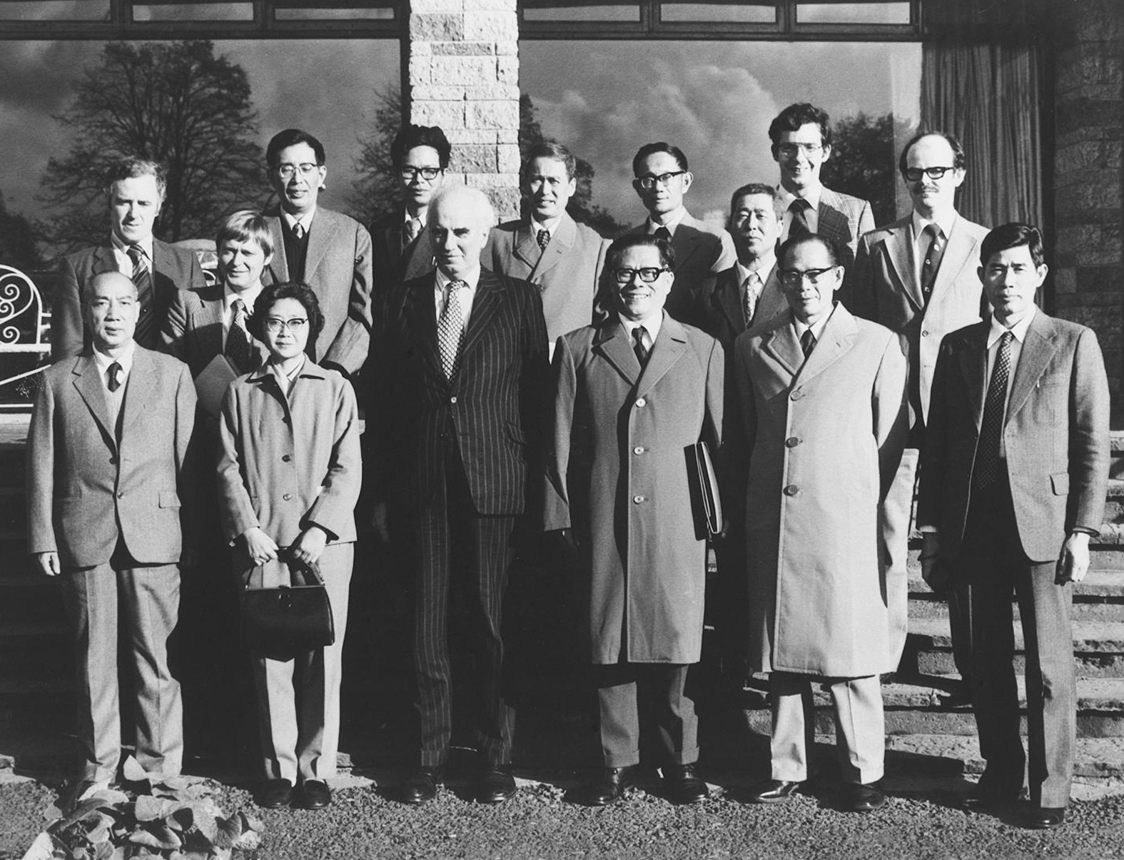 ▲1964年6月,江泽民同志(二排右一)在法国艾克斯莱班出席国际电工委员会会议期间同与会代表合影。