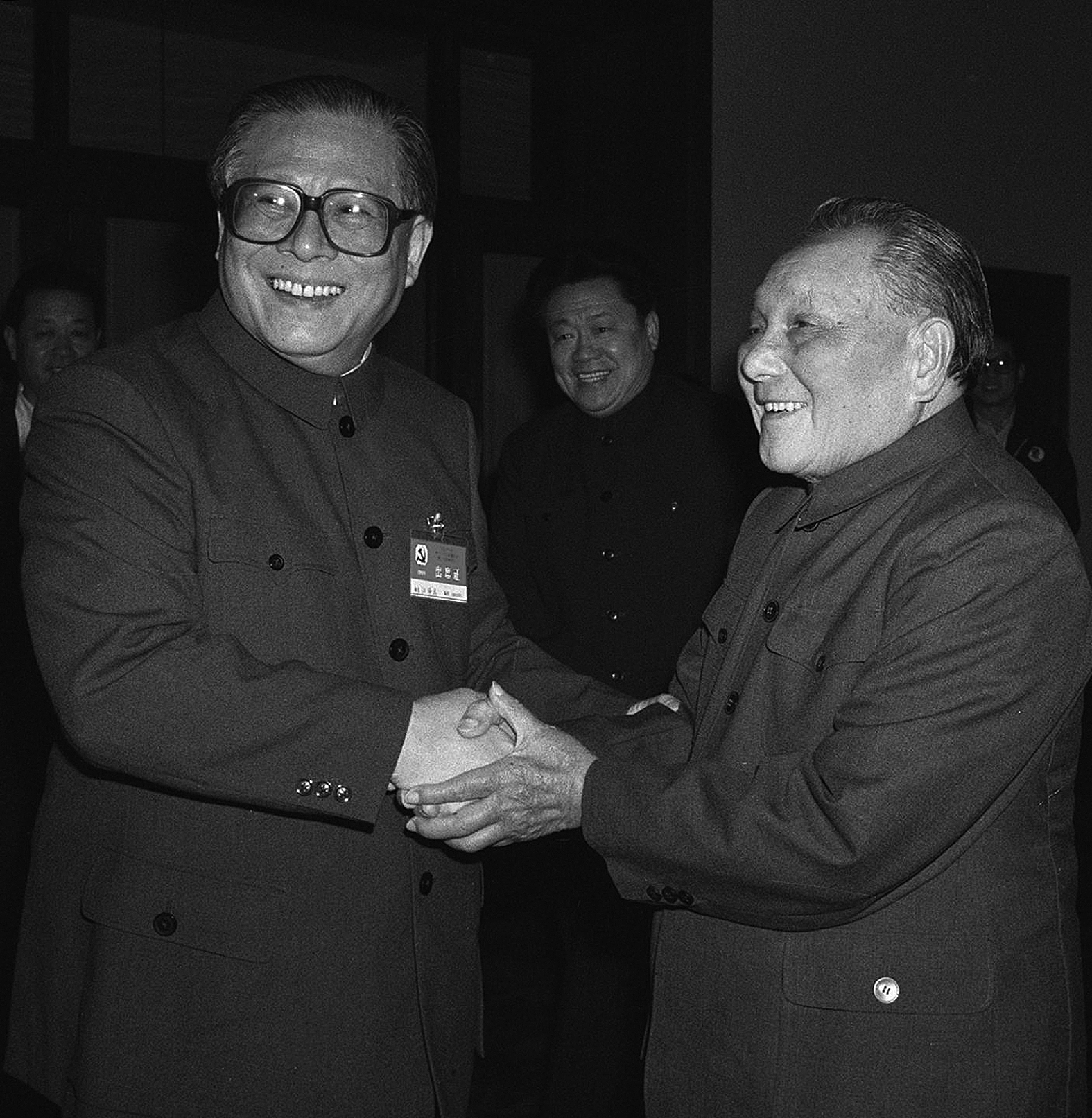 ▲1989年11月6日至9日,中国共产党第十三届中央委员会第五次全体会议在北京召开。这是邓小平同志和江泽民同志亲切握手。