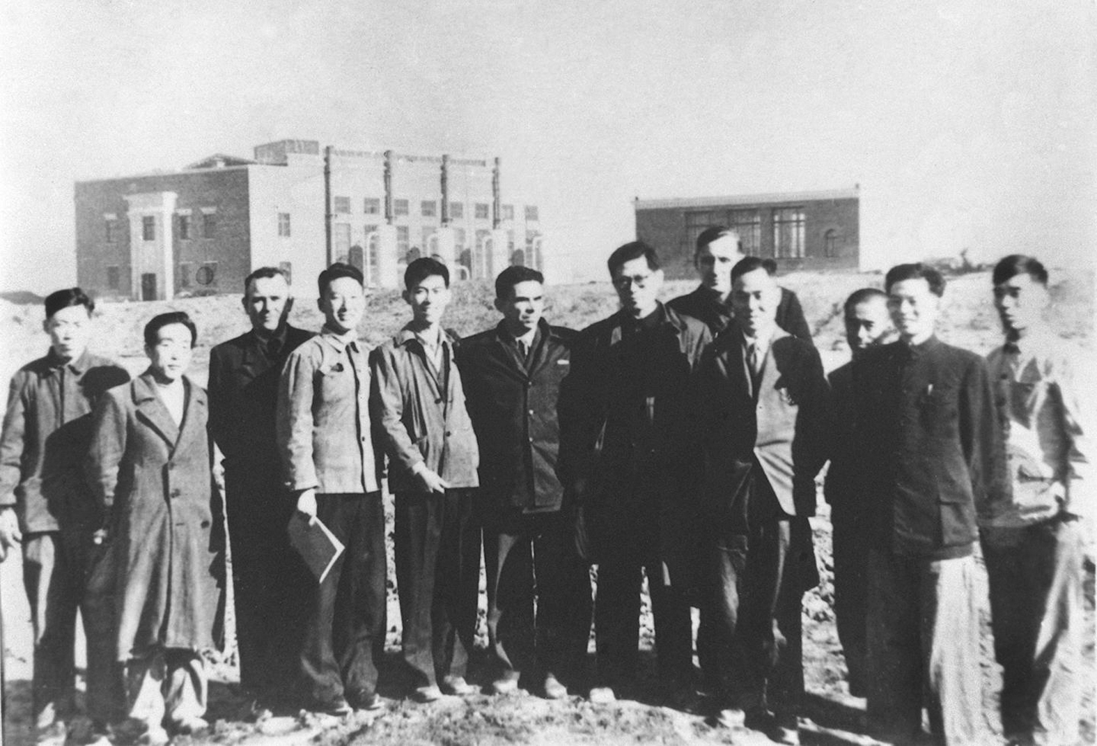 ▲1956年,江泽民同志(左七)在长春第一汽车制造厂同援建一汽的苏联专家等合影。
