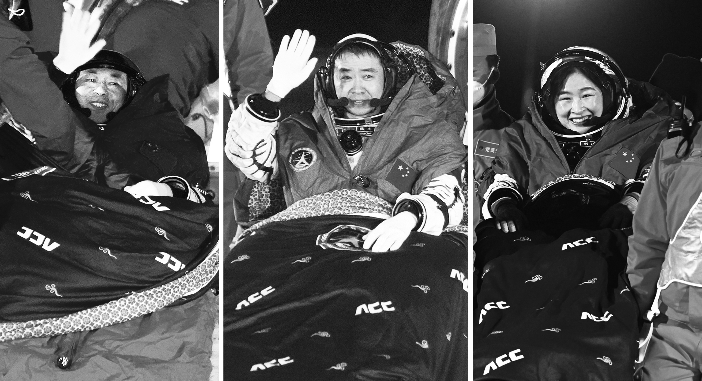 12月4日,神舟十四号载人飞船返回舱在东风着陆场成功着陆。这是航天员陈冬(中)、刘洋(右)、蔡旭哲安全顺利出舱。 新华社发