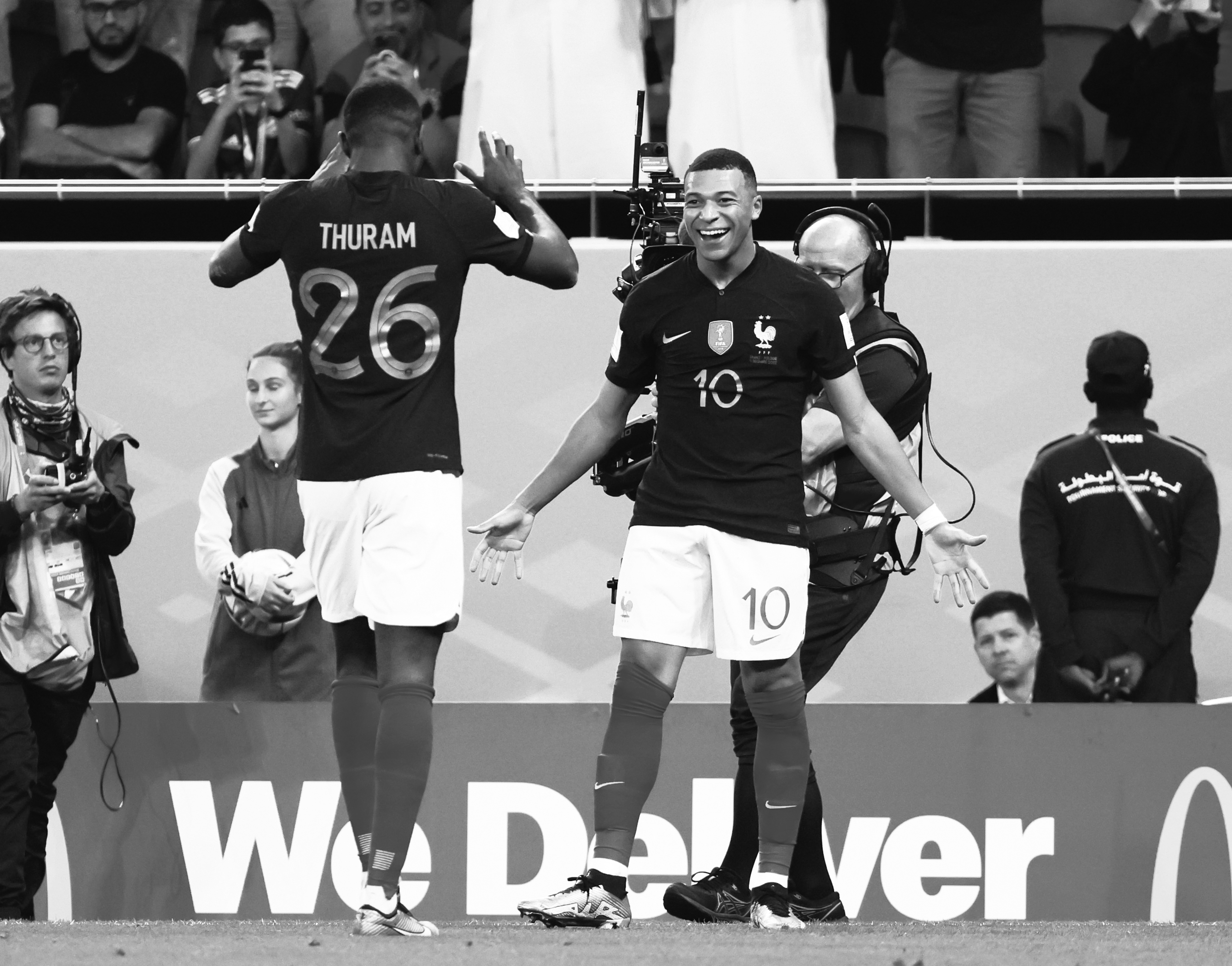12月4日,法国队球员姆巴佩(右四)在比赛中庆祝进球。当日,在卡塔尔多哈阿图玛玛球场进行的2022卡塔尔世界杯足球赛八分之一决赛中,法国队以3比1战胜波兰队。