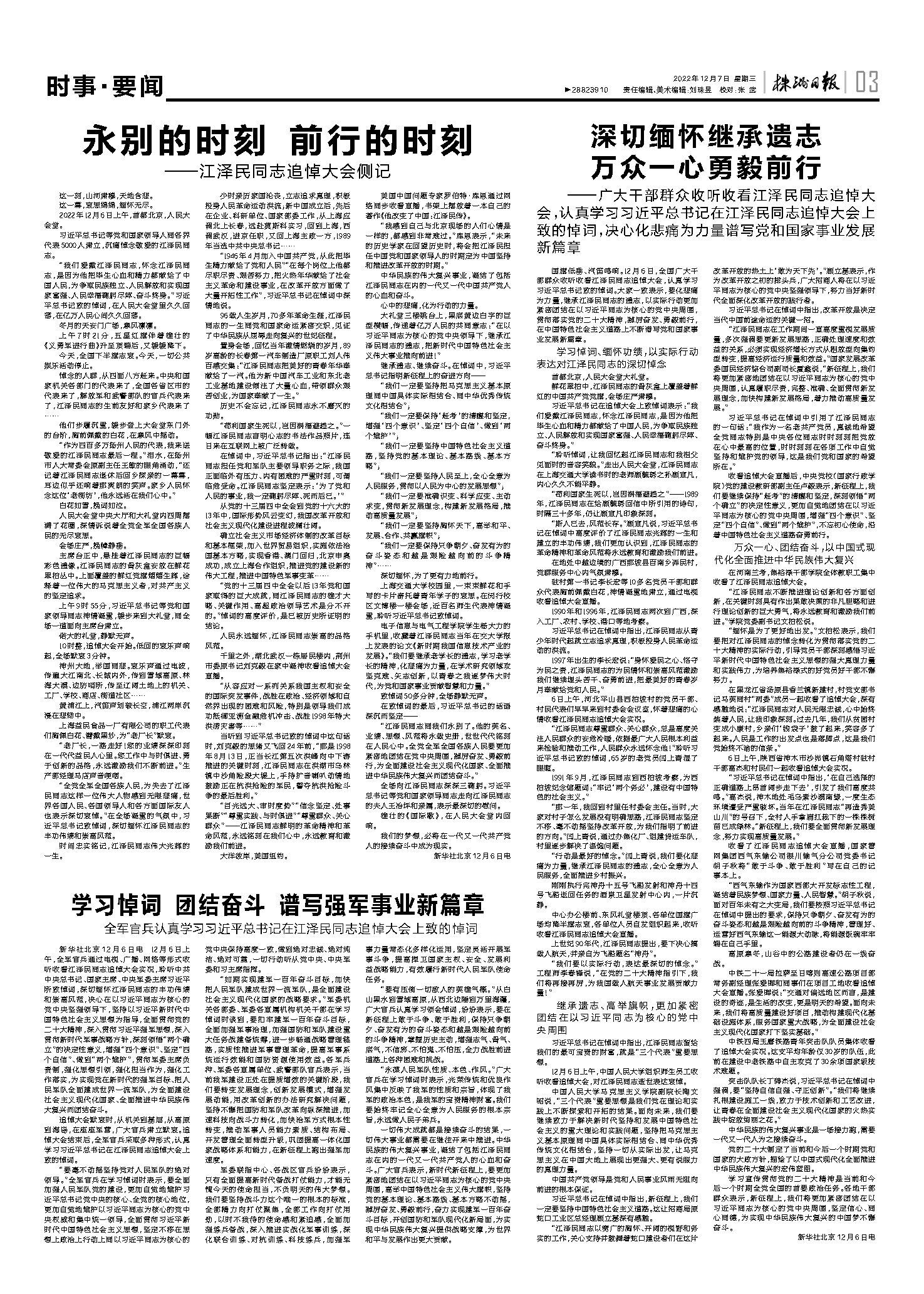 “江泽民同志同我们永别了。他的英名、业绩、思想、风范将永载史册,世世代代铭刻在人民心中。全党全军全国各族人民要更加紧密地团结在党中央周围,踔厉奋发、勇毅前行,为全面建设社会主义现代化国家、全面推进中华民族伟大复兴而团结奋斗。”