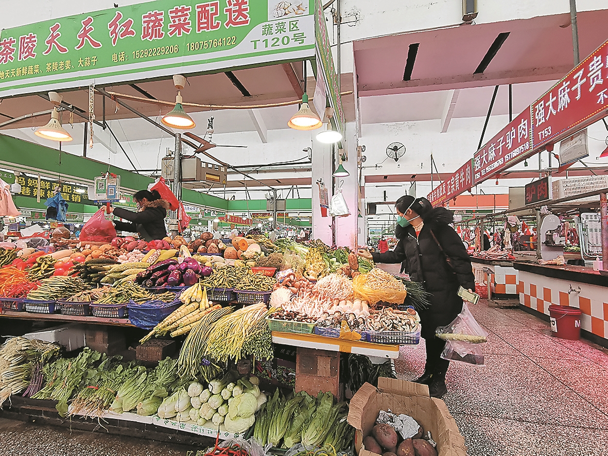 在天元区天纺农贸市场,市民正在选购蔬菜。 记者/王军 摄