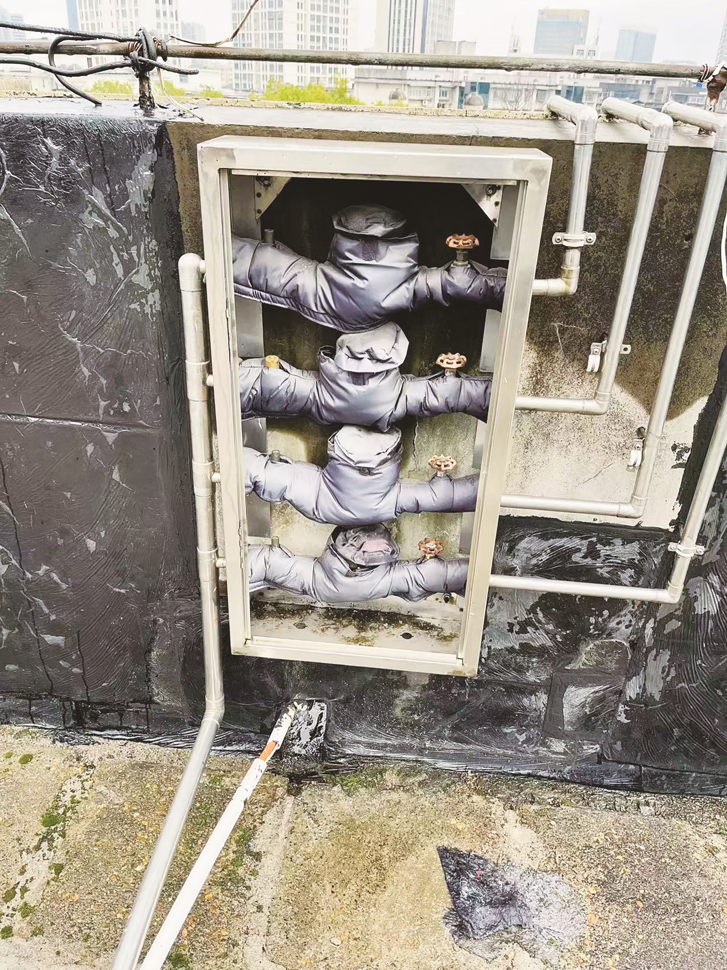12月1日上午十点,在芦淞区一处老旧小区的楼顶,几位工作人员打开一个箱子,给里面的设施“穿衣服”。目前,市水务集团已经对全市范围内现存的5000多个裸露在外的供水设施进行保护。