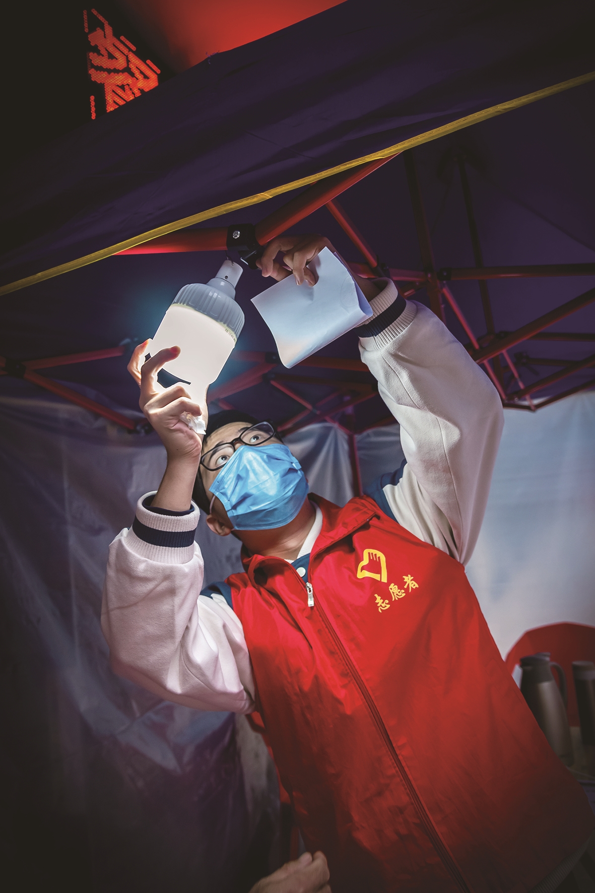 在小区,他们引导人们做核酸,善意地反复提醒大家保持两米距离。下雨了,或者到了晚上,他们又成为电工、木工,搭建工棚。居民没有囤菜,他们联系团购送生活物资。有急诊了,他们想方设法组织救治……