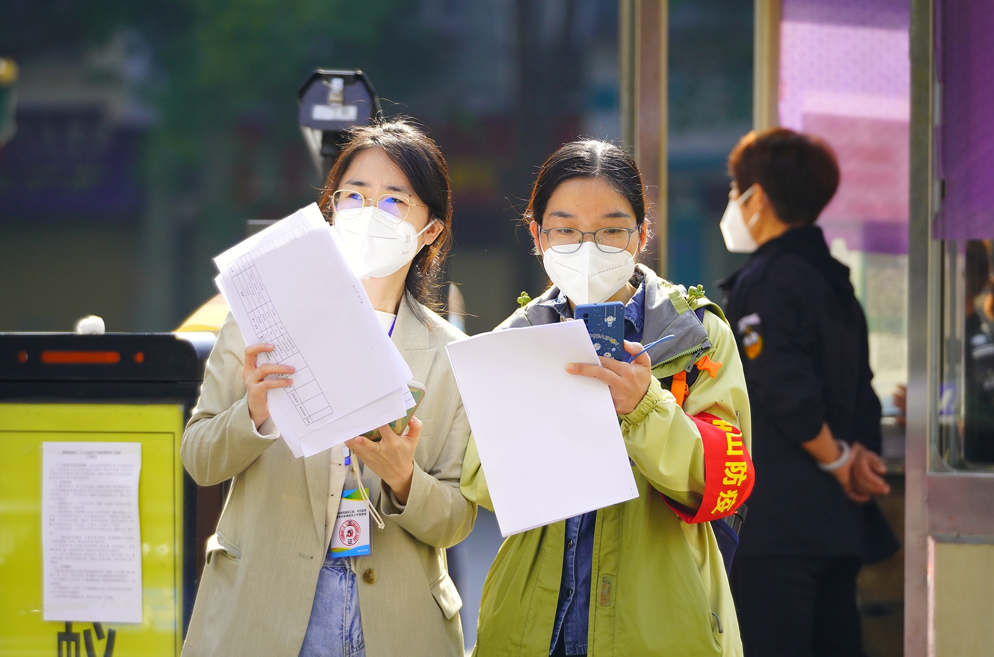 社区人员与蓝盾小区志愿者对接协调工作。 谢政文 摄