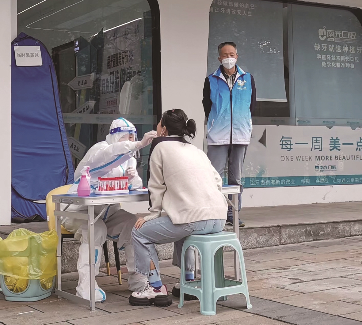 湖塘社区一对老夫妻争当志愿者,一个做核酸,一个维护秩序。陈静 摄