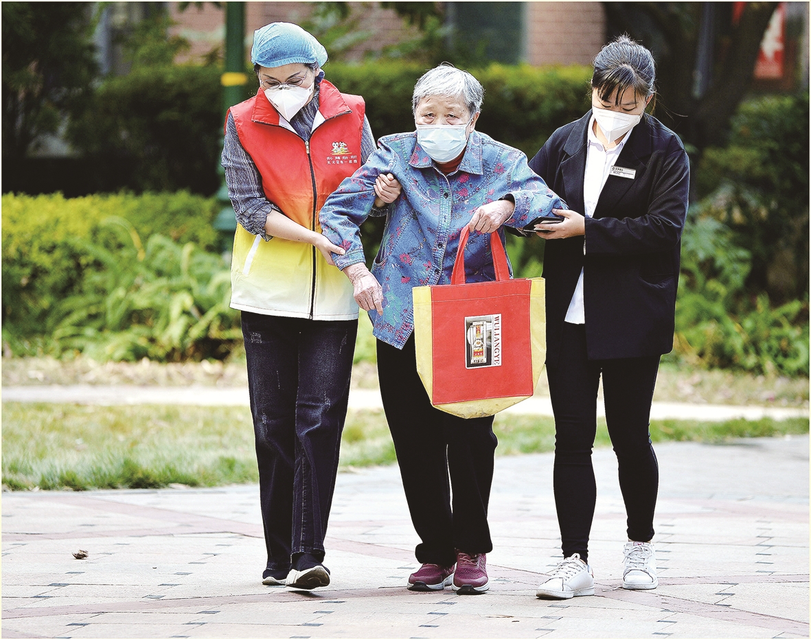 新塘社区志愿者搀扶着行动不便的老人。 陈亚伟 摄