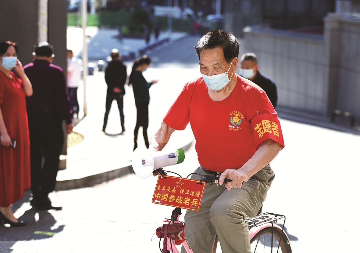 83岁的退伍老兵、原轮胎厂退休工人黄兵生做志愿者,在小区内宣传抗疫。 谭小球 摄