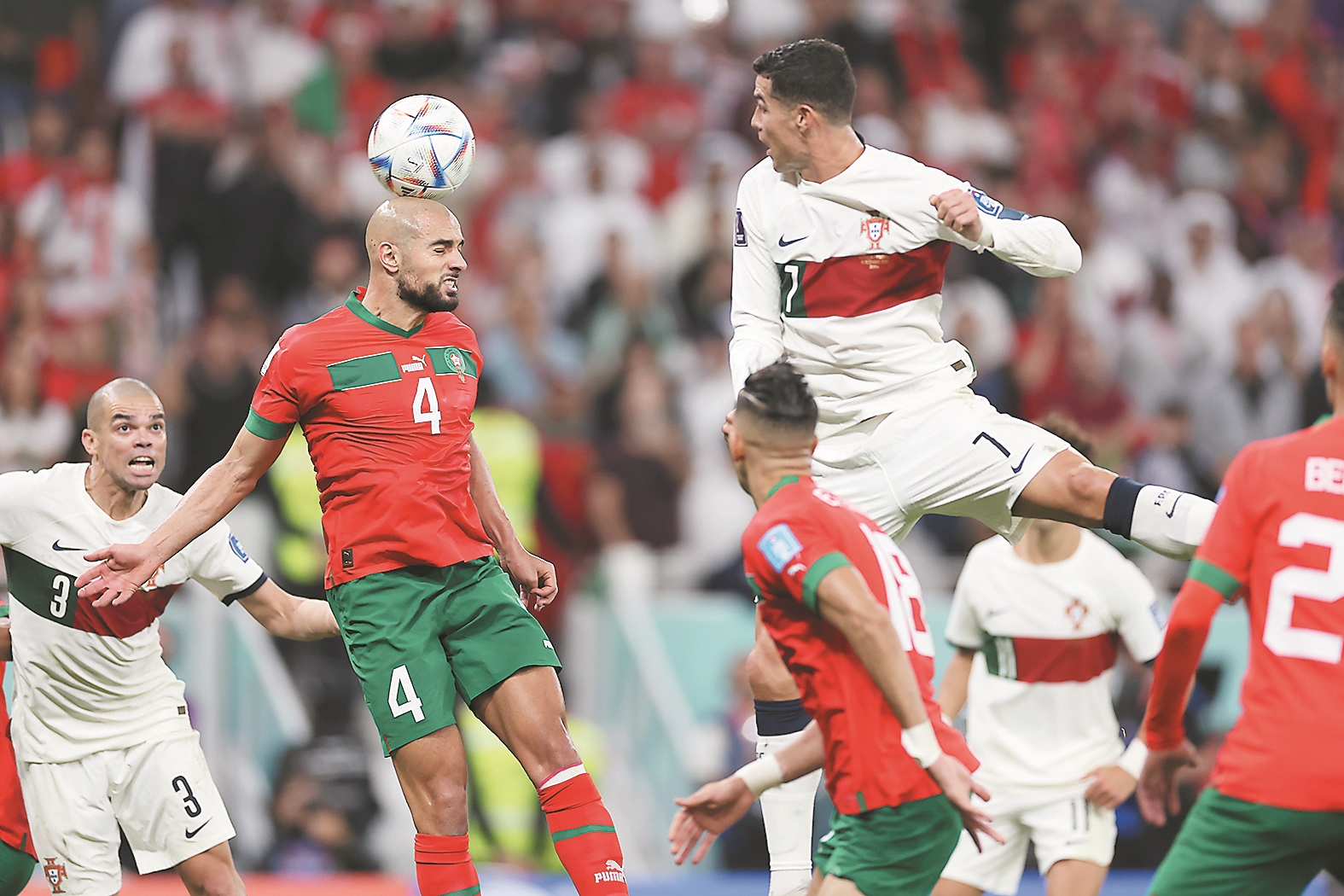 12月10日,葡萄牙队球员克·罗纳尔多(上右一)与摩洛哥队球员索夫扬·阿姆拉巴特(左二)在比赛中争顶。