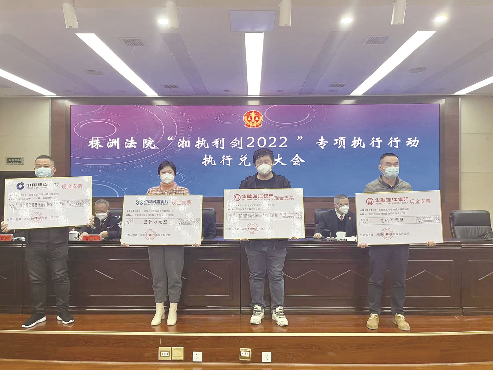 根据省高院统一部署,从今年4月份开始,株洲两级法院精心部署开展“湘执利剑2022”专项执行行动,全市法院执结涉黑恶势力刑事裁判涉财执行案件、涉职务犯罪刑事裁判涉财执行案件、涉民生执行案件等六类重点案件1768件,执行到位金额44.49亿余元。