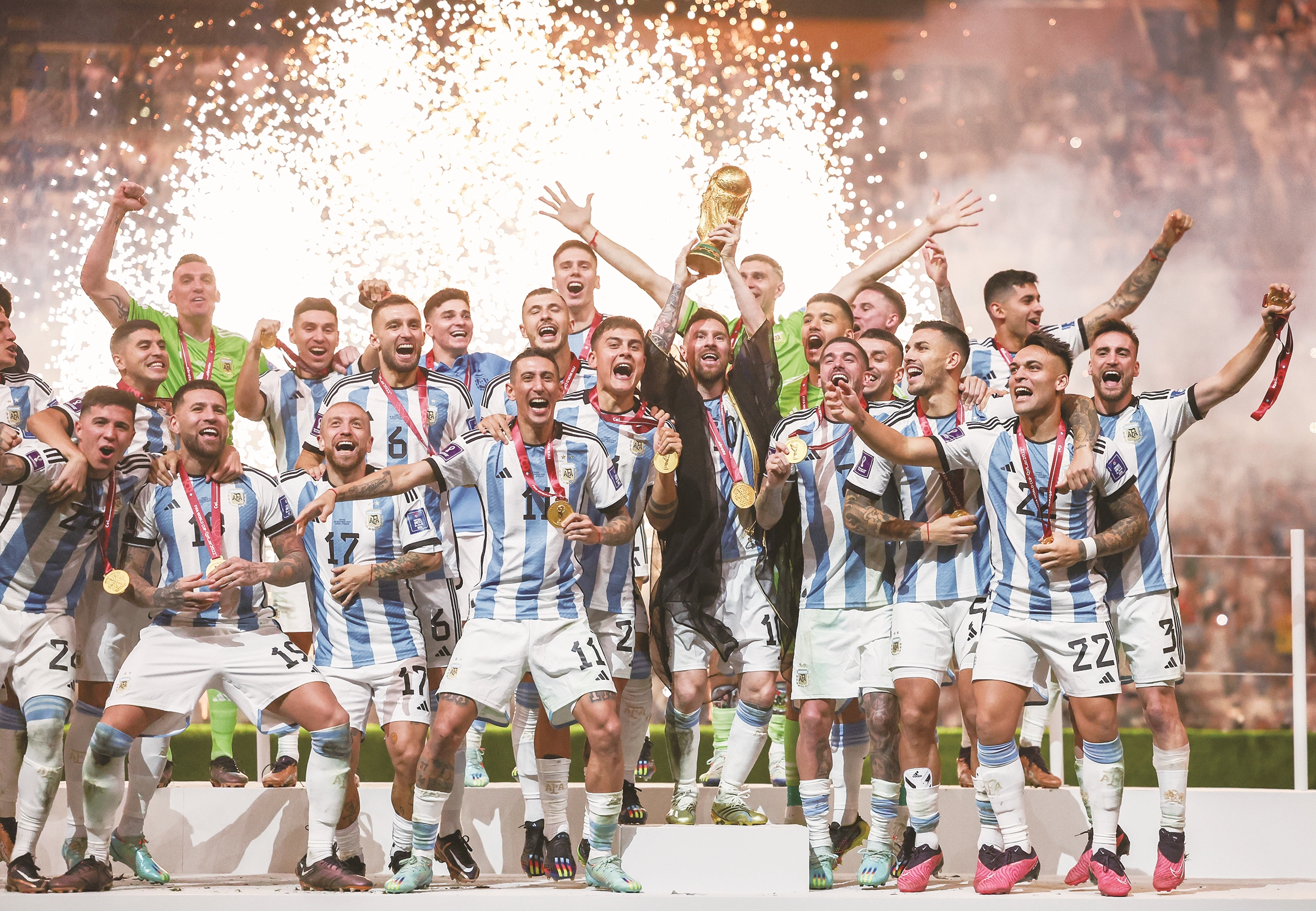 12月18日,阿根廷队球员在颁奖仪式上庆祝。 新华社记者 曹灿 摄