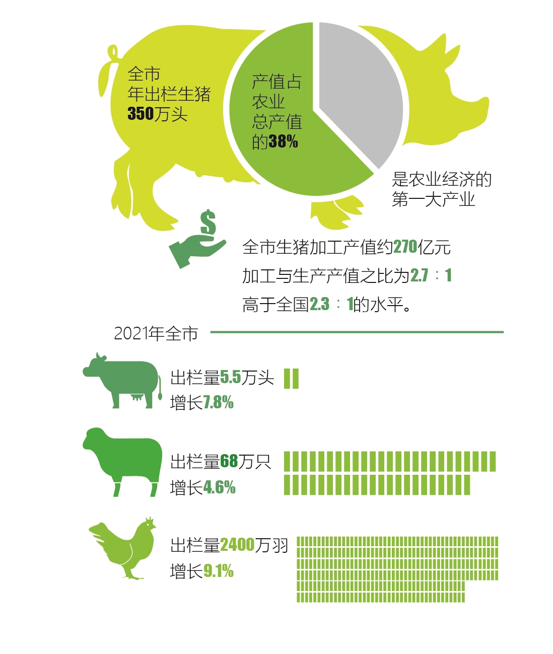 数据显示,目前全市生猪年出栏量在350万头左右,生猪全产业链产值占农业总产值的38%,成为农业经济的第一大产业,全市牛、羊、家禽出栏量呈现稳定增加态势……