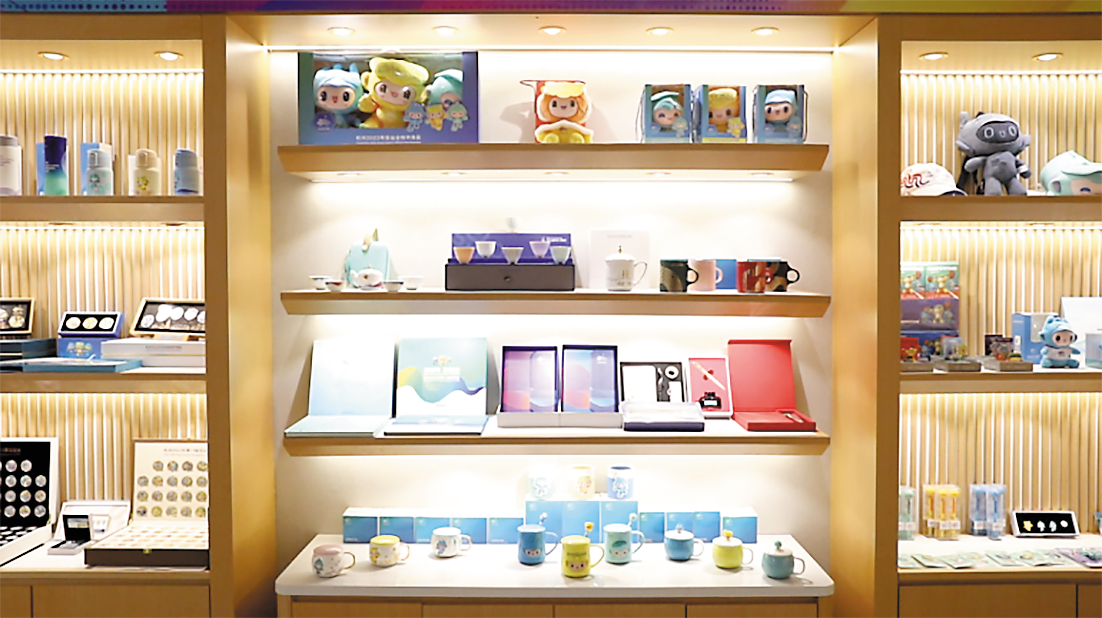 株洲日报讯(全媒体记者/刘毅 通讯员/朱煦冰 张帅) 12月19日,走进湖南华联瓷业股份有限公司总部大楼,展厅里一面标有“杭州2022年第19届亚运会特许商品零售店”的展品墙映入眼帘,墙上摆放着本届亚运会的吉祥物“琮琮”“宸宸”“莲莲”,以及瓷器、文具、徽章等多种特许商品。