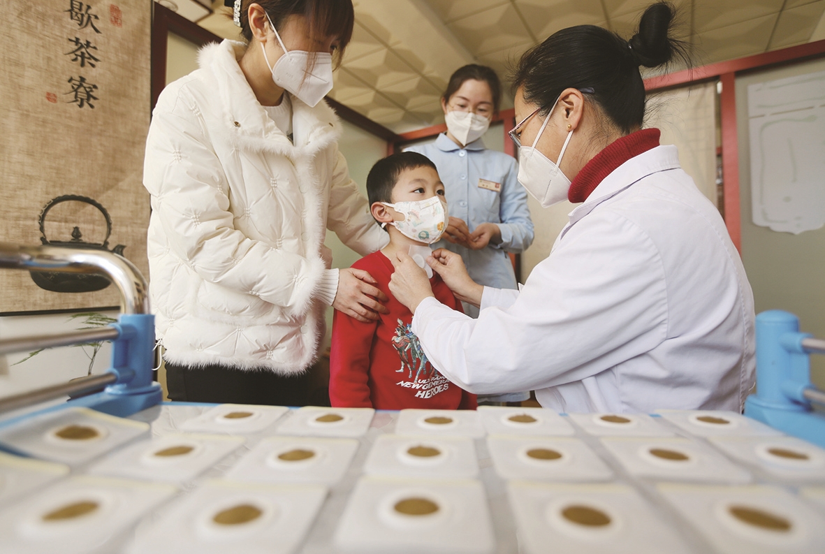 12月19日,山东省临沂市沂南县中医医院,医生为一名儿童进行穴位贴敷疗法。