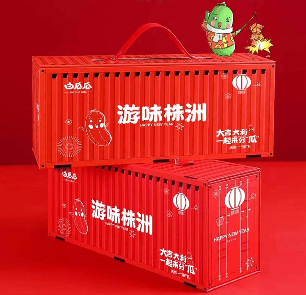 礼盒外包装采用集装箱造型,旨在致敬和纪念株洲的工业发展历史。对联、红包等是春节不可缺少的“年味”,出品方特邀著名本土作家聂鑫森老师创作,“中国书法兰亭奖”获得者,书法家叶剑平老师书写了一副对联放入礼盒,给株洲市民送上了一份文化厚礼。