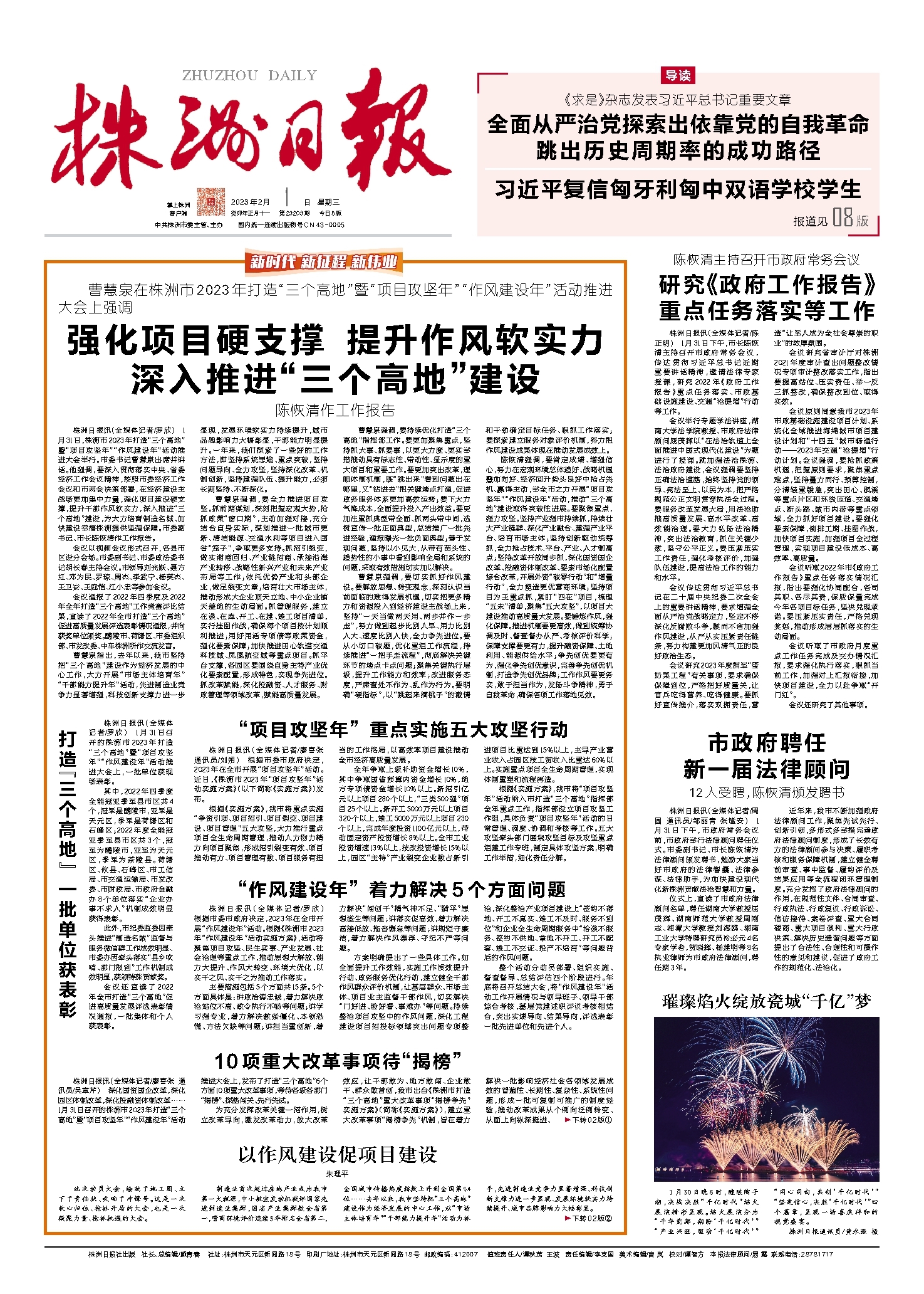 株洲日报讯(全媒体记者/罗欣) 1月31日,株洲市2023年打造“三个高地”暨“项目攻坚年”“作风建设年”活动推进大会举行。市委书记曹慧泉出席并讲话。他强调,要深入贯彻落实中央、省委经济工作会议精神,按照市委经济工作会议和市两会决策部署,在经济建设主战场更加集中力量,强化项目建设硬支撑,提升干部作风软实力,深入推进“三个高地”建设,为大力培育制造名城、加快建设幸福株洲提供坚强保障。市委副书记、市长陈恢清作工作报告。