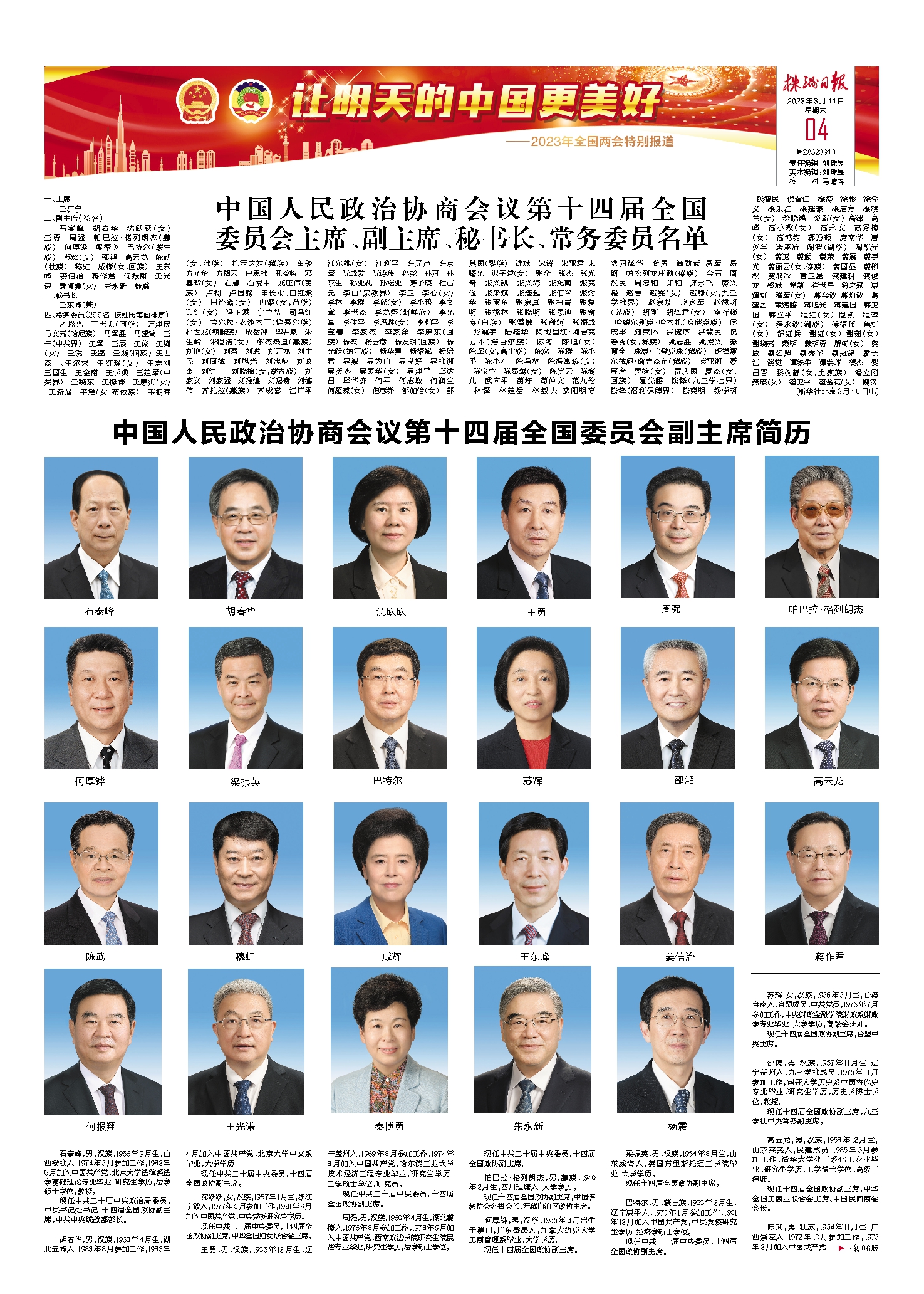 中国人民政治协商会议第十四届全国委员会主席、副主席、秘书长、常务委员名单