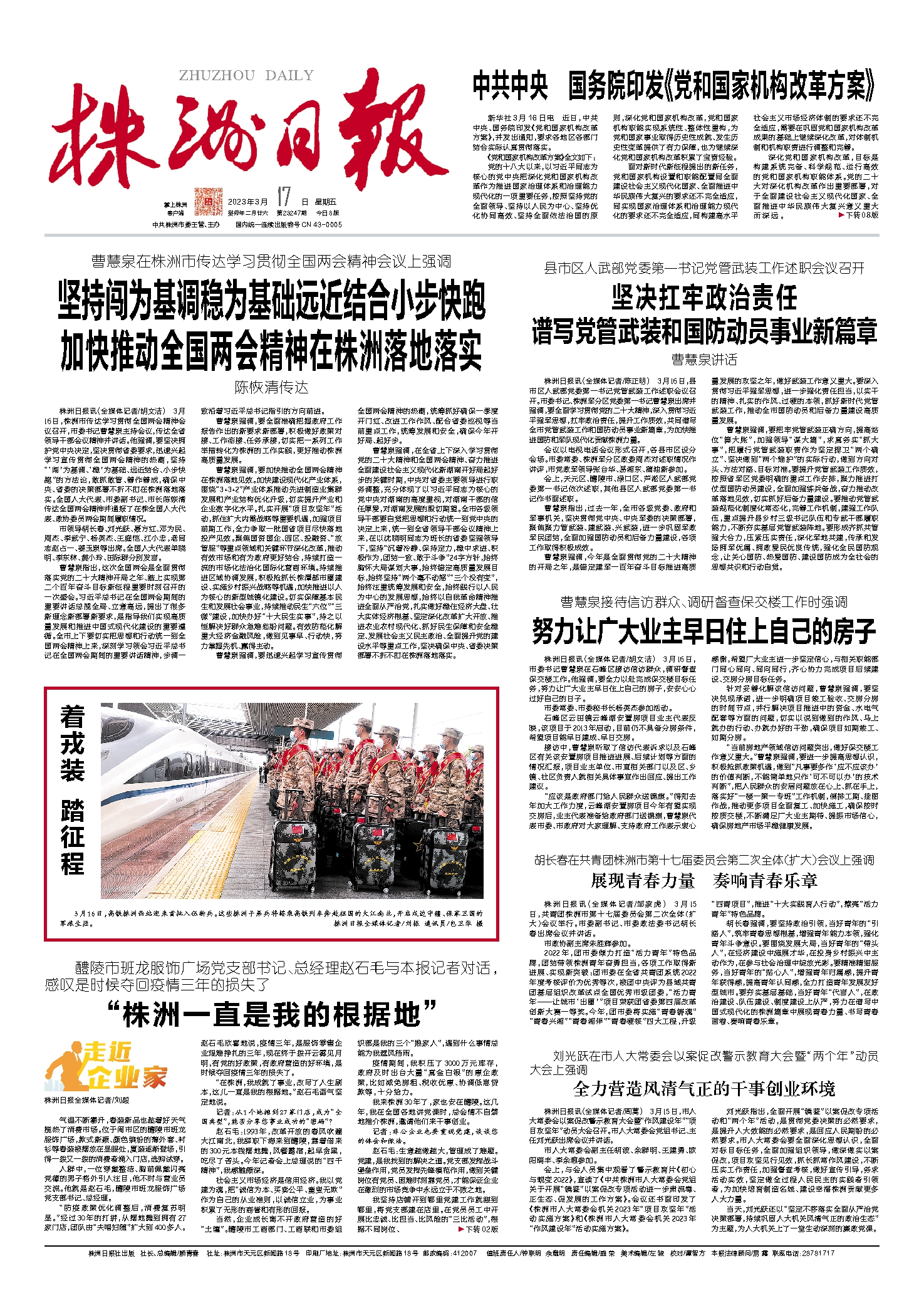 株洲日报讯(全媒体记者/陈正明) 3月16日,县市区人武部党委第一书记党管武装工作述职会议召开。市委书记、株洲军分区党委第一书记曹慧泉出席并强调,要全面学习贯彻党的二十大精神,深入贯彻习近平强军思想,扛牢政治责任,提升工作质效,共同谱写全市党管武装工作和国防动员事业新篇章,为加快推进国防和军队现代化贡献株洲力量。