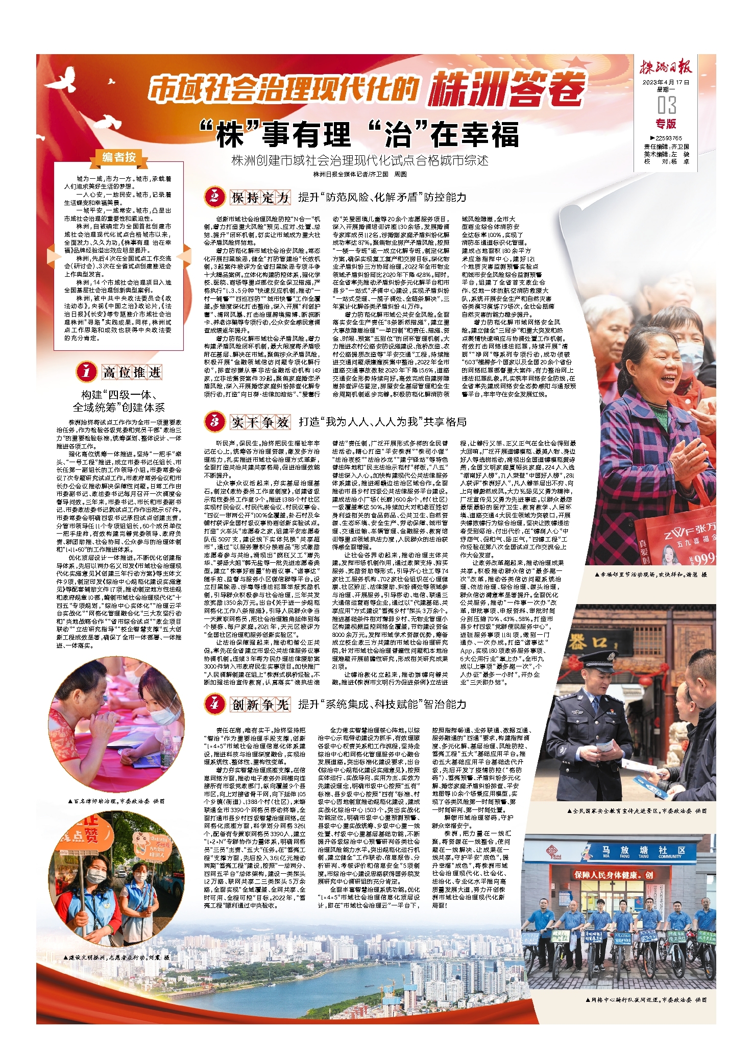 株洲,把力量在一线汇聚,将资源在一线整合,使问题在一线解决、让成果在一线共享。守护平安“底色”,提升幸福“成色”,将株洲市域社会治理现代化、社会化、法治化、专业化水平推向高质量发展大道,努力开创株洲市域社会治理现代化新局面!