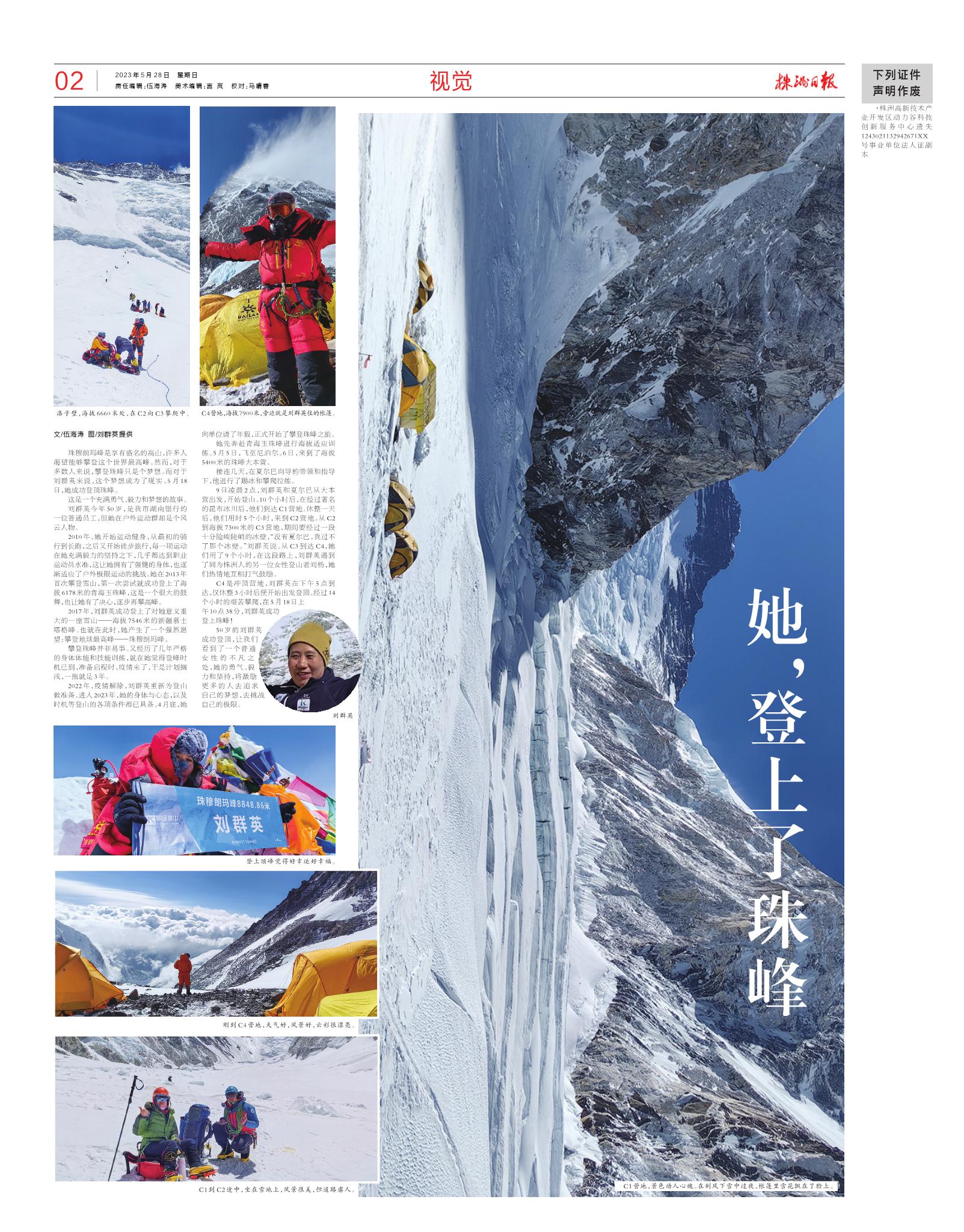 9日凌晨2点,刘群英和夏尔巴从大本营出发,开始登山。10个小时后,在经过著名的昆布冰川后,他们到达C1营地。休整一天后,他们用时5个小时,来到C2营地。从C2到海拔7300米的C3营地,期间要经过一段十分险峻陡峭的冰壁,“没有夏尔巴,我过不了那个冰壁。”刘群英说。从C3到达C4,她们用了9个小时,在这段路上,刘群英遇到了同为株洲人的另一位女性登山者刘杨,她们热情地互相打气鼓励。